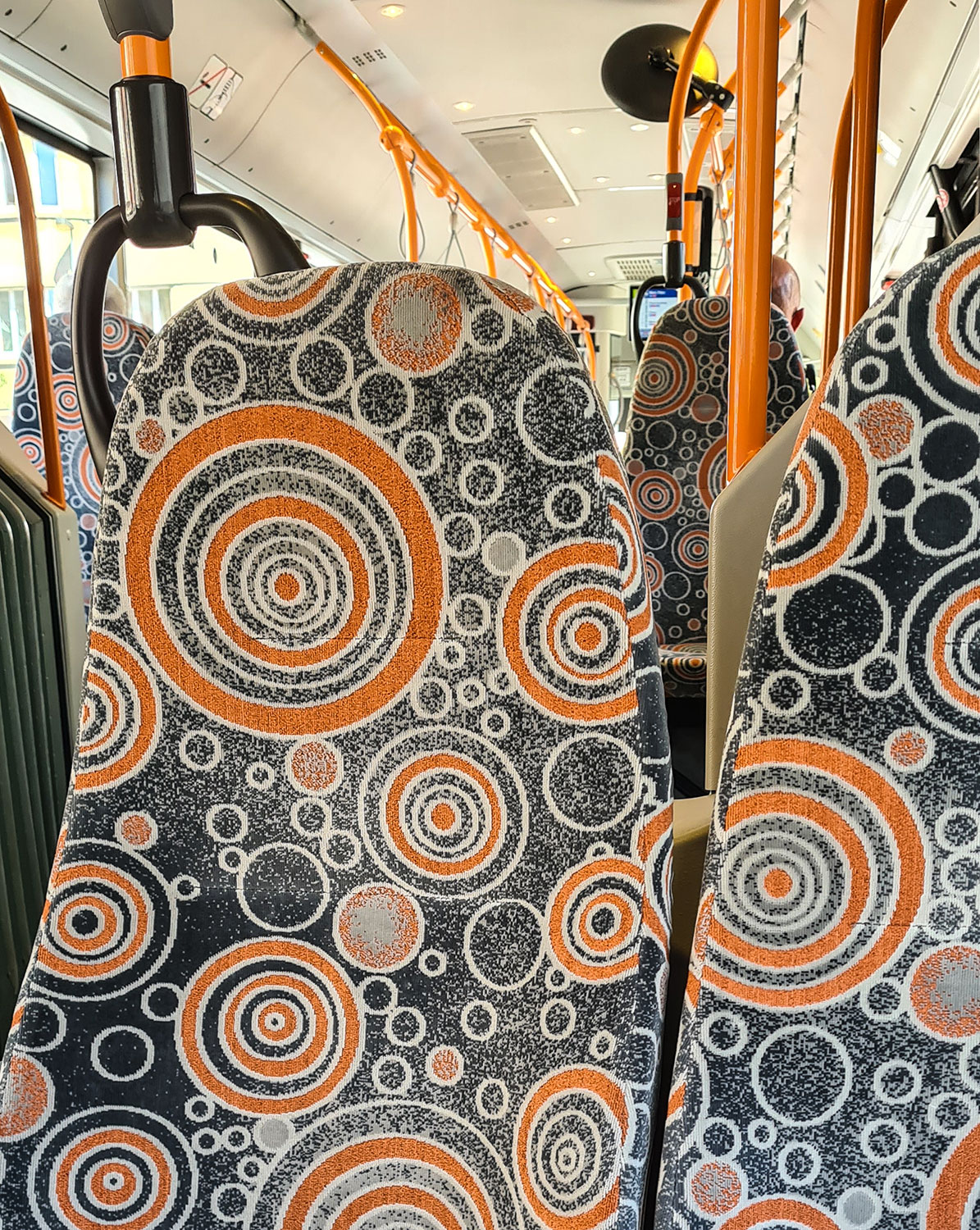 Neben den gestreiften, modernen Fahrzeugen, sind auch ältere Busse auf der Linie 5 unterwegs. Mintgrün außen und innen mit hübschem Retromuster. Wie gefallen sie dir?