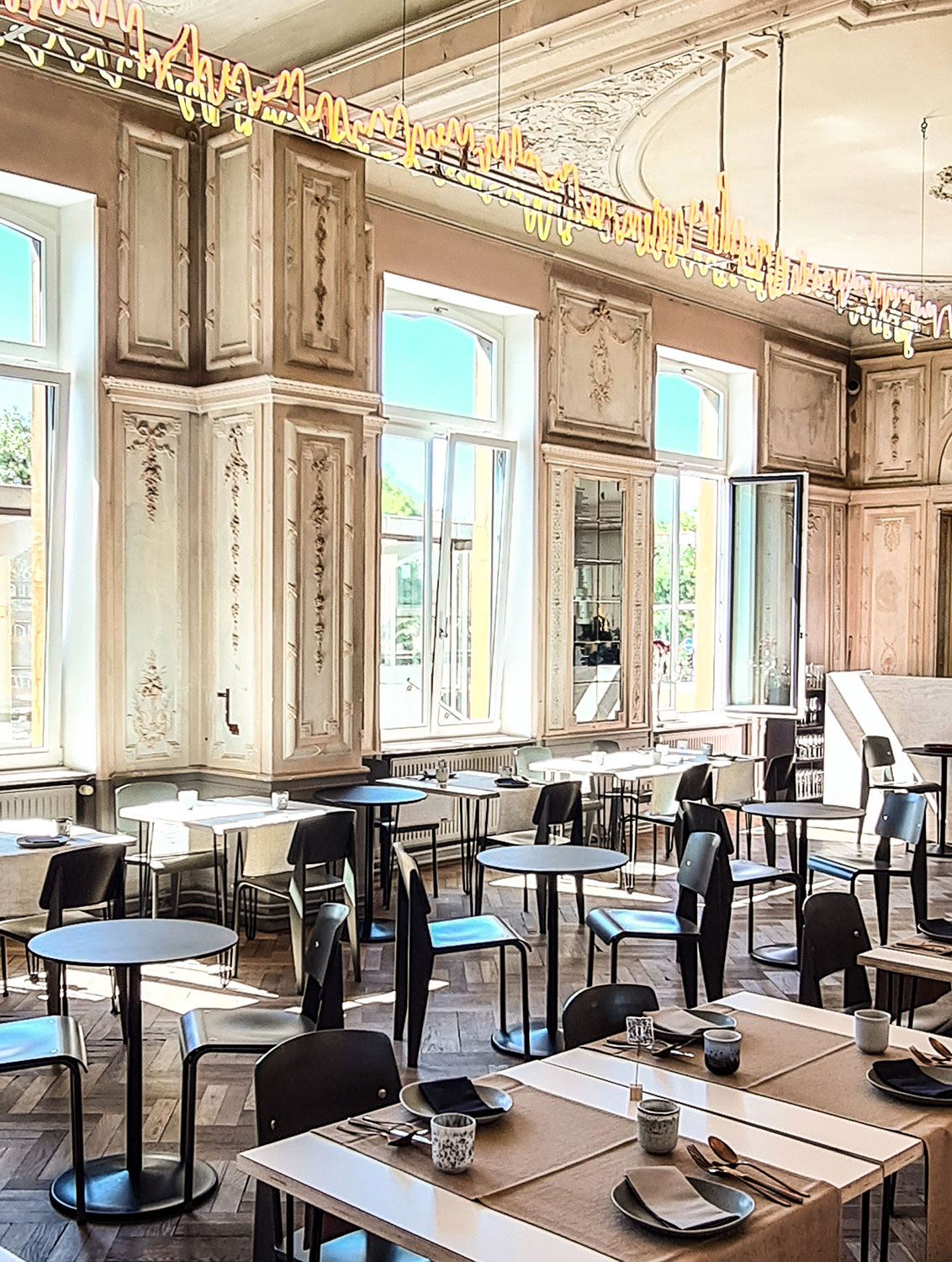 Beim Rausgehen werfe ich noch einen Blick ins Restaurant. Sehr elegant sieht es aus und erinnert mit den verzierten Stuckdecken an vergangene Zeiten. An damals, als die Luxemburger Gesellschaft im Casino opulente Feste feierte.