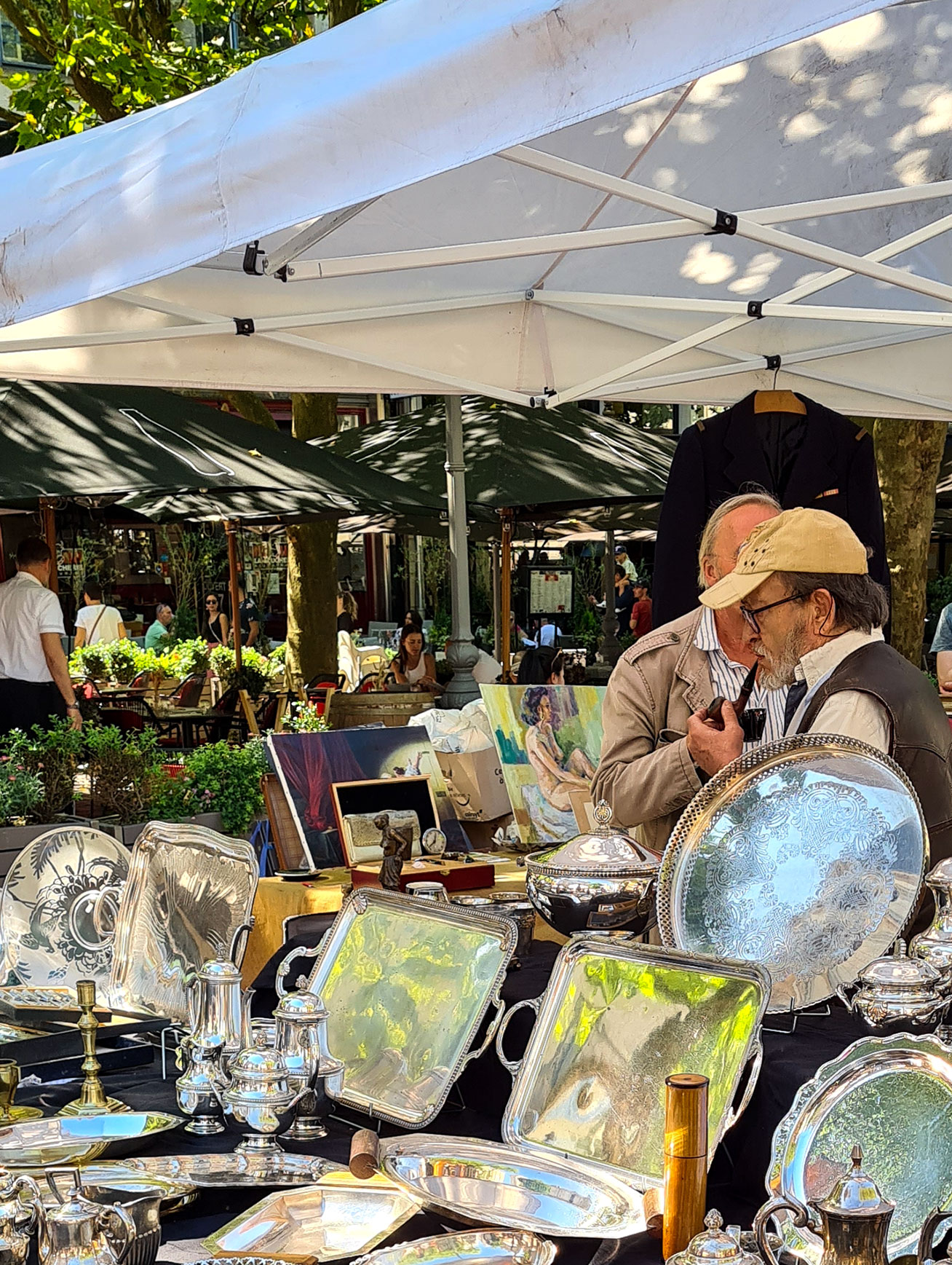 Meine Entdeckertour mit der Linie 5 beginnt am Place d‘ Armes. Alle paar Wochen findet dort samstags ein Flohmarkt statt. Ok, es sind nur ein dutzend Stände mit Porzellan und Silber, Büchern und Krimskrams. Der Markt ist kleiner, als erwartet, aber der Platz ist sehr malerisch.