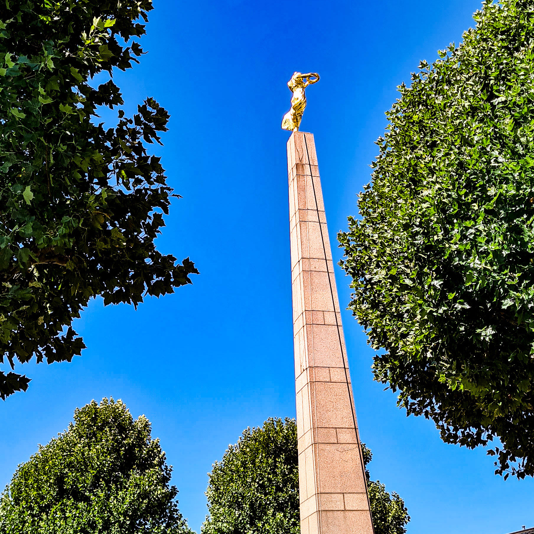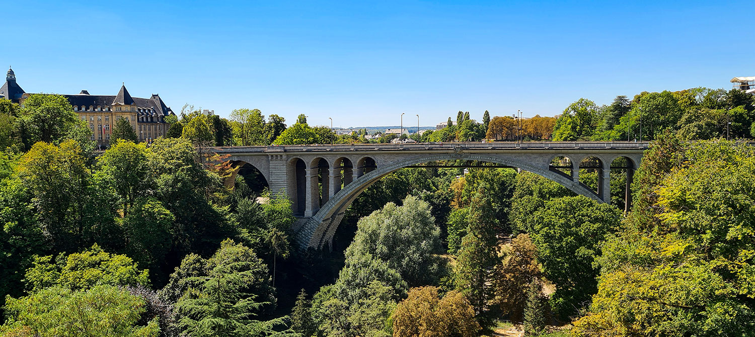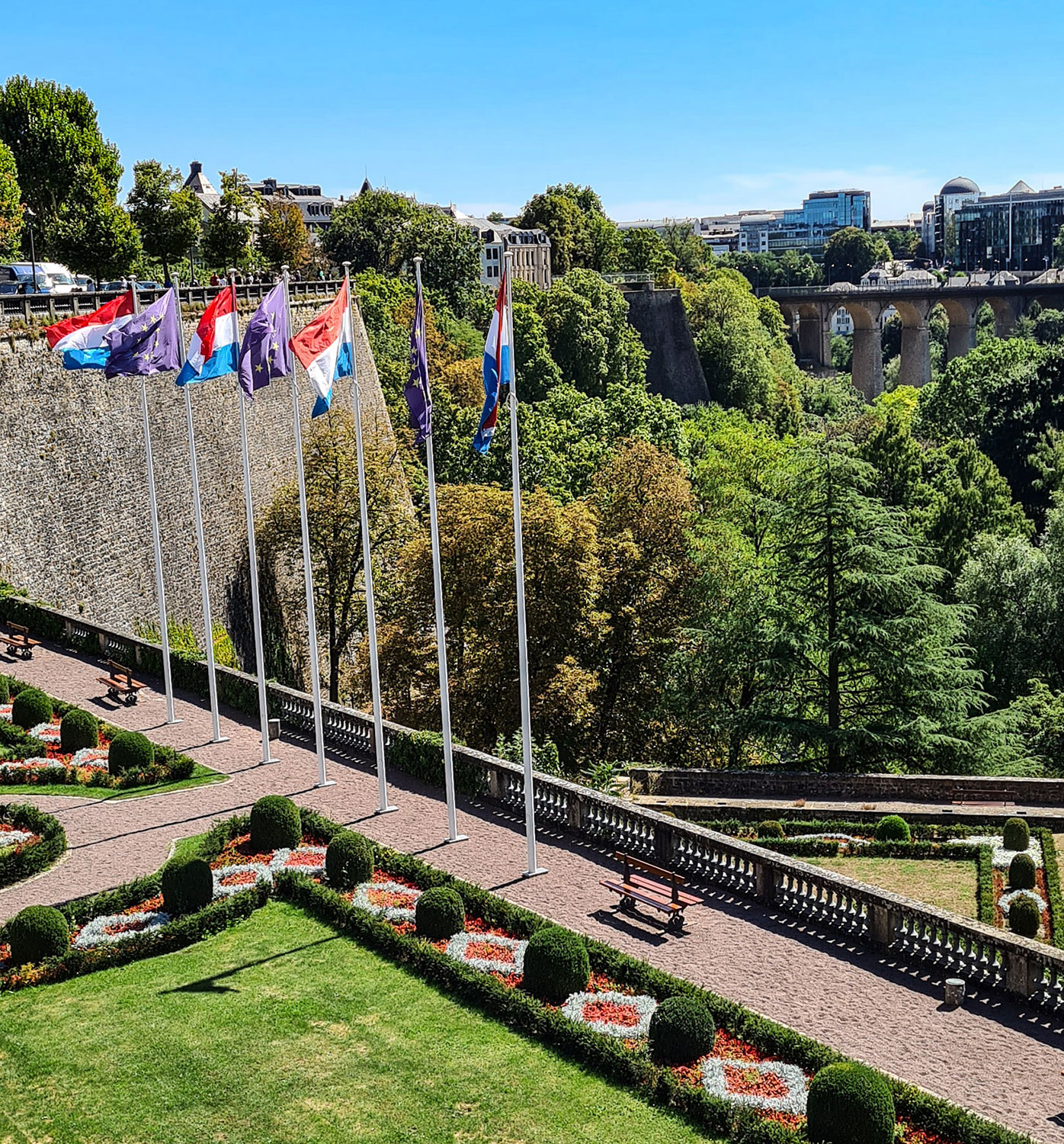 Von der Aussichtsplattform am Verfassungsplatz hast du einen schönen Blick auf das Pétrusse-Tal. Zwei Brücken verbinden die Oberstadt mit dem Bahnhofsviertel: rechts die Adolphebrücke mit ihren Steinbögen, links die Passerale. Steil fällt der Hang hinab ins grüne Tal, in dem man wunderbar spazieren kann. Auf halber Höhe liegt ein schöner Garten, Flaggen flattern im Wind. Nein, ich will nicht hinab. Zu heiß, zu mühsam erscheint mir der anschließende Aufstieg. Ich genieße den Ausblick, schaue Touristen zu, wie sie Selfies machen und ihre Liebsten vor dem Mahnmal „Gelle Fra“ fotografieren. Die Säule mit der goldenen Frauenfigur ist zum Gedenken an die gefallenen Soldaten errichtet worden und symbolisiert die Freiheit und den Widerstand des Luxemburger Volkes.