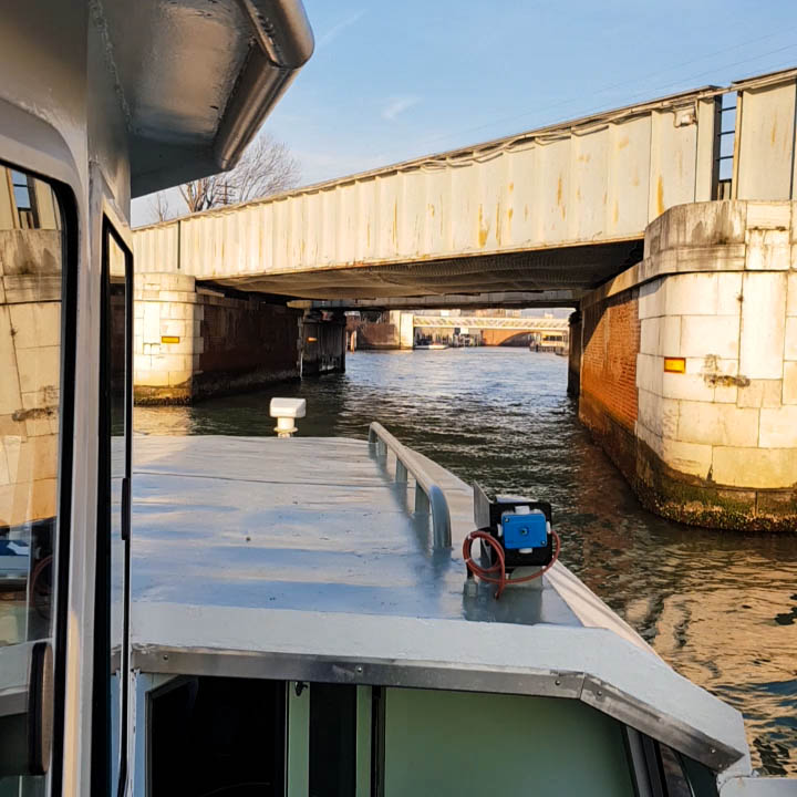 Im Südwesten der Insel erstrecken sich der Hafen und die Terminals für Fähren und Kreuzfahrtschiffe. Der Wasserbus navigiert anschließen durch den Canal de Santa Chiara, unter niedrigen Brücken hindurch bis zum Hauptbahnhof. Und im Nu bist du wieder am Ausgangspunkt, der Guglie-Brücke. Die reine Fahrtzeit der Rundfahrt beträgt 82 Minuten.
