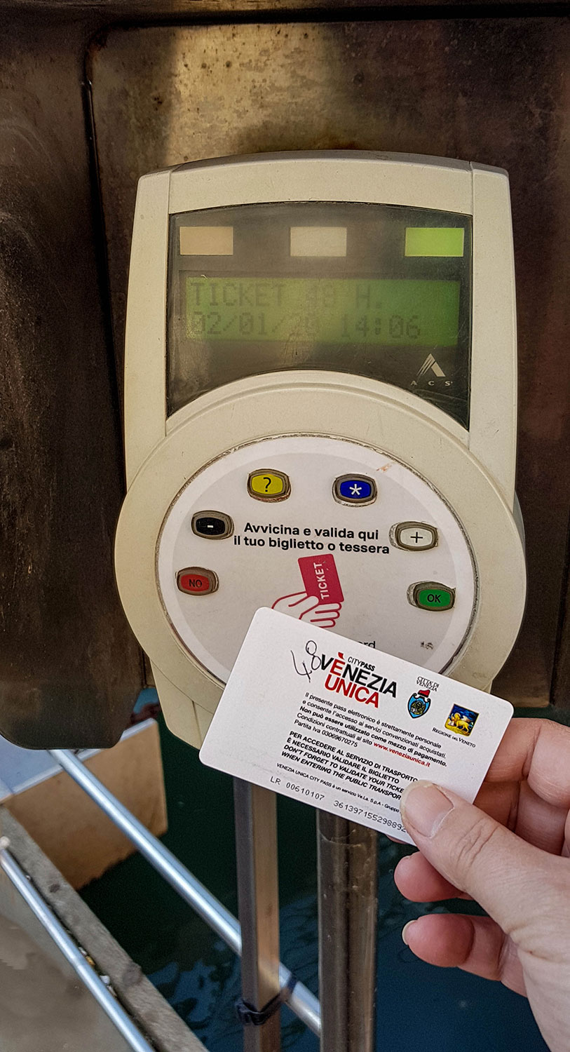 Die ACTV-Tickets sind so groß wie eine Scheck-Karte. Wichtig: vor jeder Fahrt musst du es entwerten. Egal ob du ein Ticket für eine Fahrt oder ein Mehrtages-Ticket hast. Und das geht so: