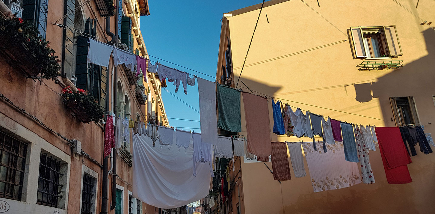 Ruhe und echten venezianischen Alltag erfährst du im Stadtteil Castello. Ich bin an der Haltestelle San Pietro Castello ausgestiegen und quer durch das Viertel bis vor zu den Biennale Gärten geschlendert. Während dieses Spaziergangs tauchst du ein in das ursprüngliche Venedig. Die vielen kleinen Häuser beherbergten einst die Arbeiter der imposanten Schiffswerft, dem Arsenale. Selbst an Neujahr flattert in Castello Wäsche zum Trocknen auf der Leine.