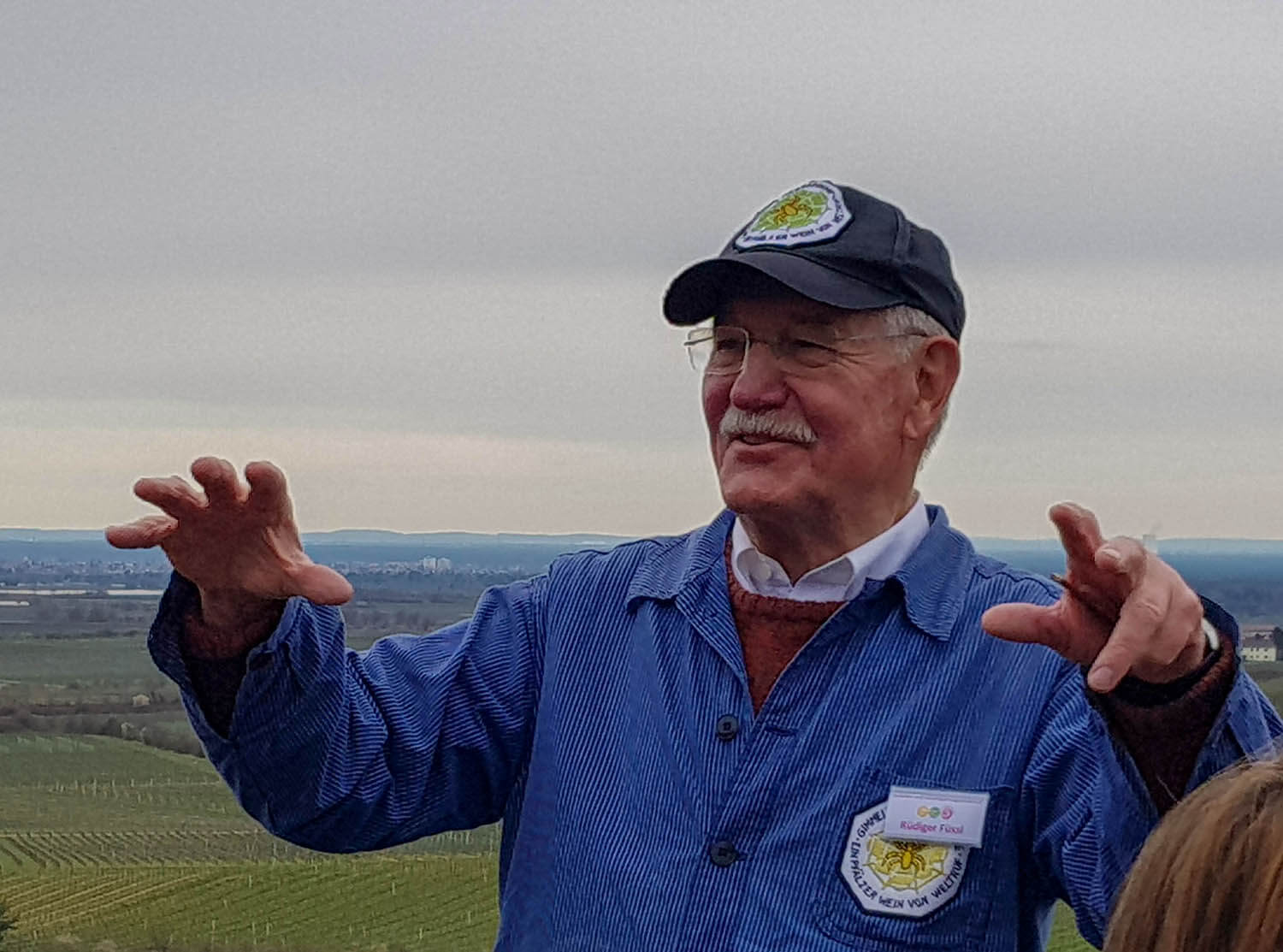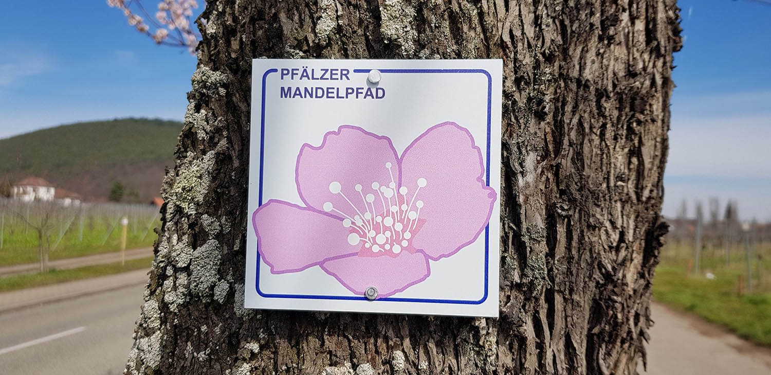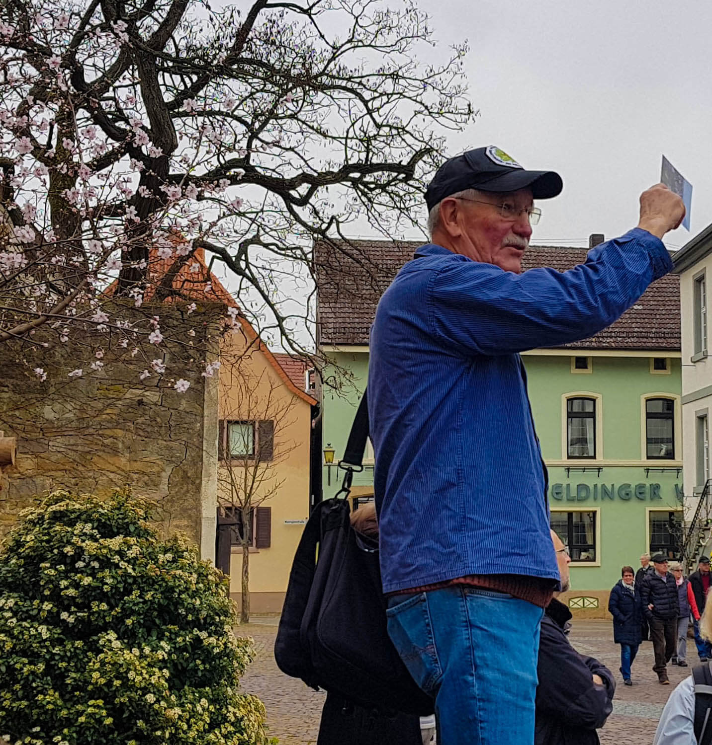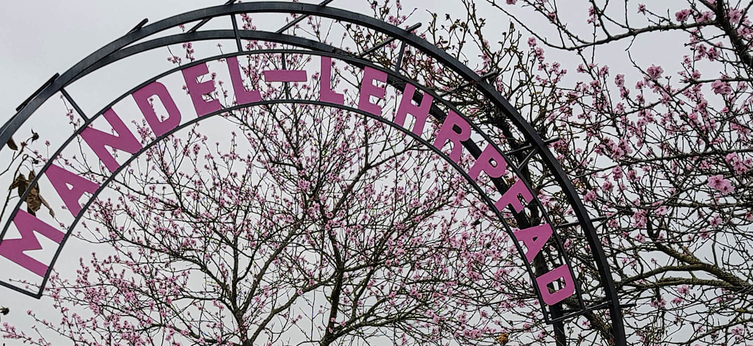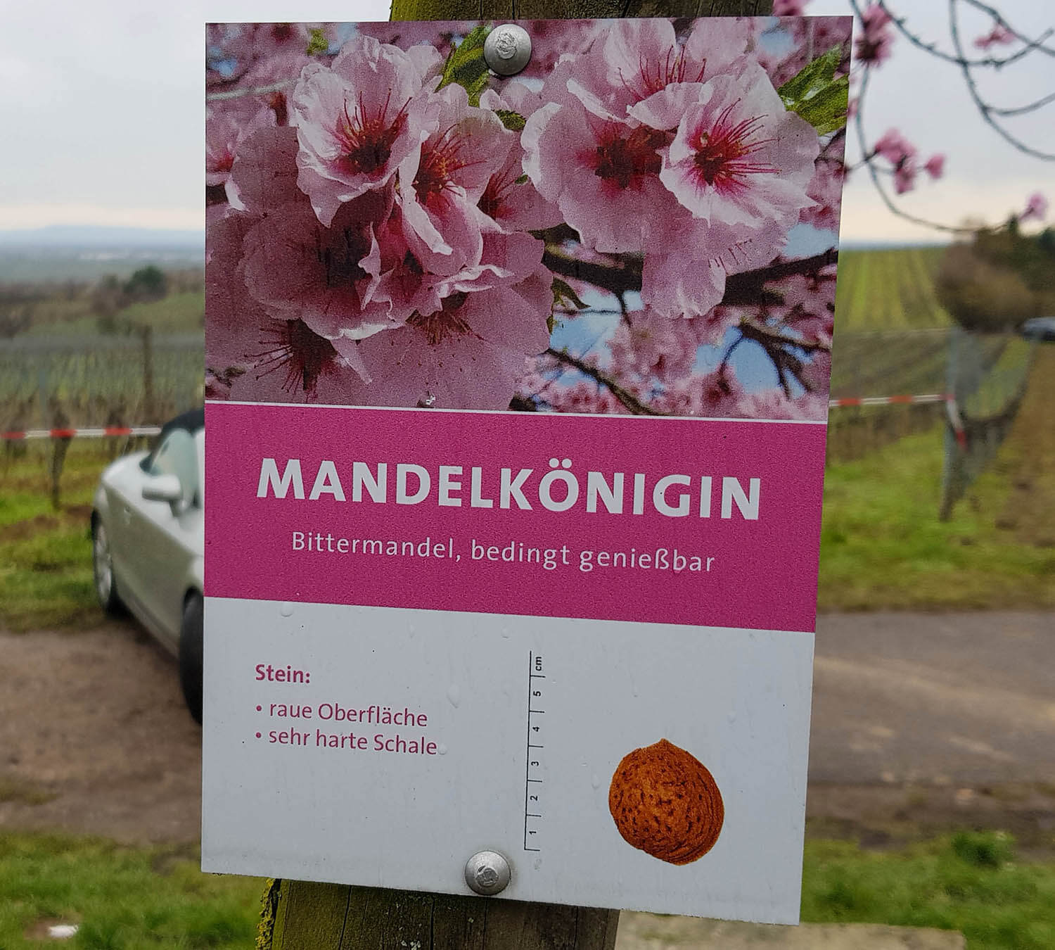 „Die Mandel ist ein Gewächs mit Migrationshintergrund“, klärt uns Rüdiger Füssl vom Verkehrs- und Verschönerungsverein auf. Die Römer hätten sie zusammen mit dem Wein und der Esskastanie mitgebracht. Bis ins 19. Jahrhundert bescherte der Mandelanbau den Winzern ein gutes Zubrot. Heute wird der Mandelbaum in Gimmeldingen nur noch zur Zierde angepflanzt. Über 2.500 Bäume befinden sich auf dem Gemeindeareal und „hier gibt es den weltweit einzigen Mandellehrpfad mit über 500 Sorten“, berichtet Füssl stolz. Und dann erklärt er uns, dass man zunächst einmal in die Bittermandel, deren Gift (Blausäure) lange zum Bekämpfen von Ratten eingesetzt wurde, und die Süßmandel, die zur Herstellung von Backaromen, Marzipan und Kosmetika verwendet wird, unterscheidet. Jede Basisvariante habe dann noch unzählige Untersorten.