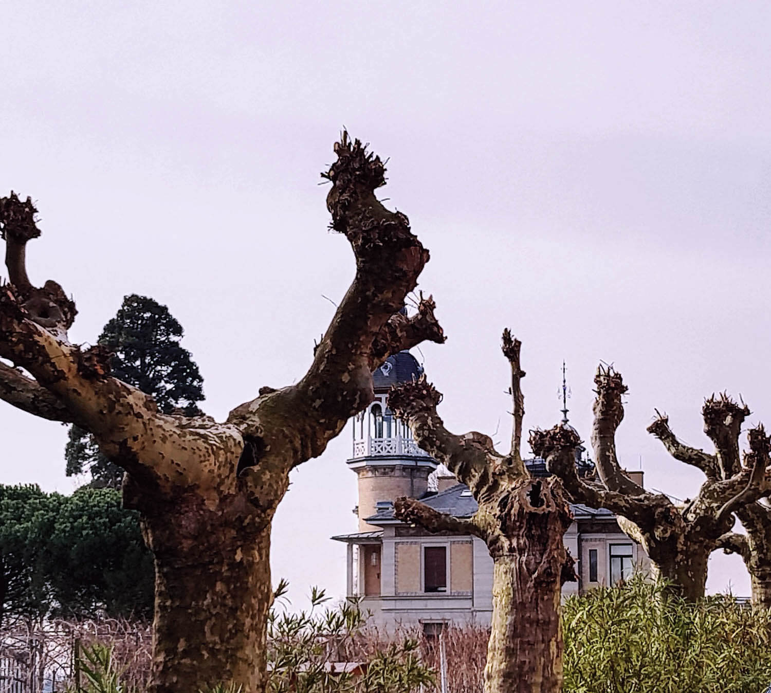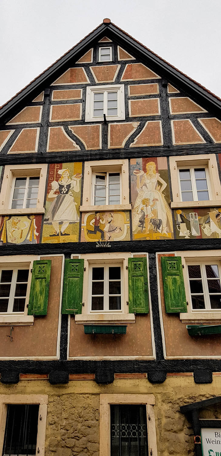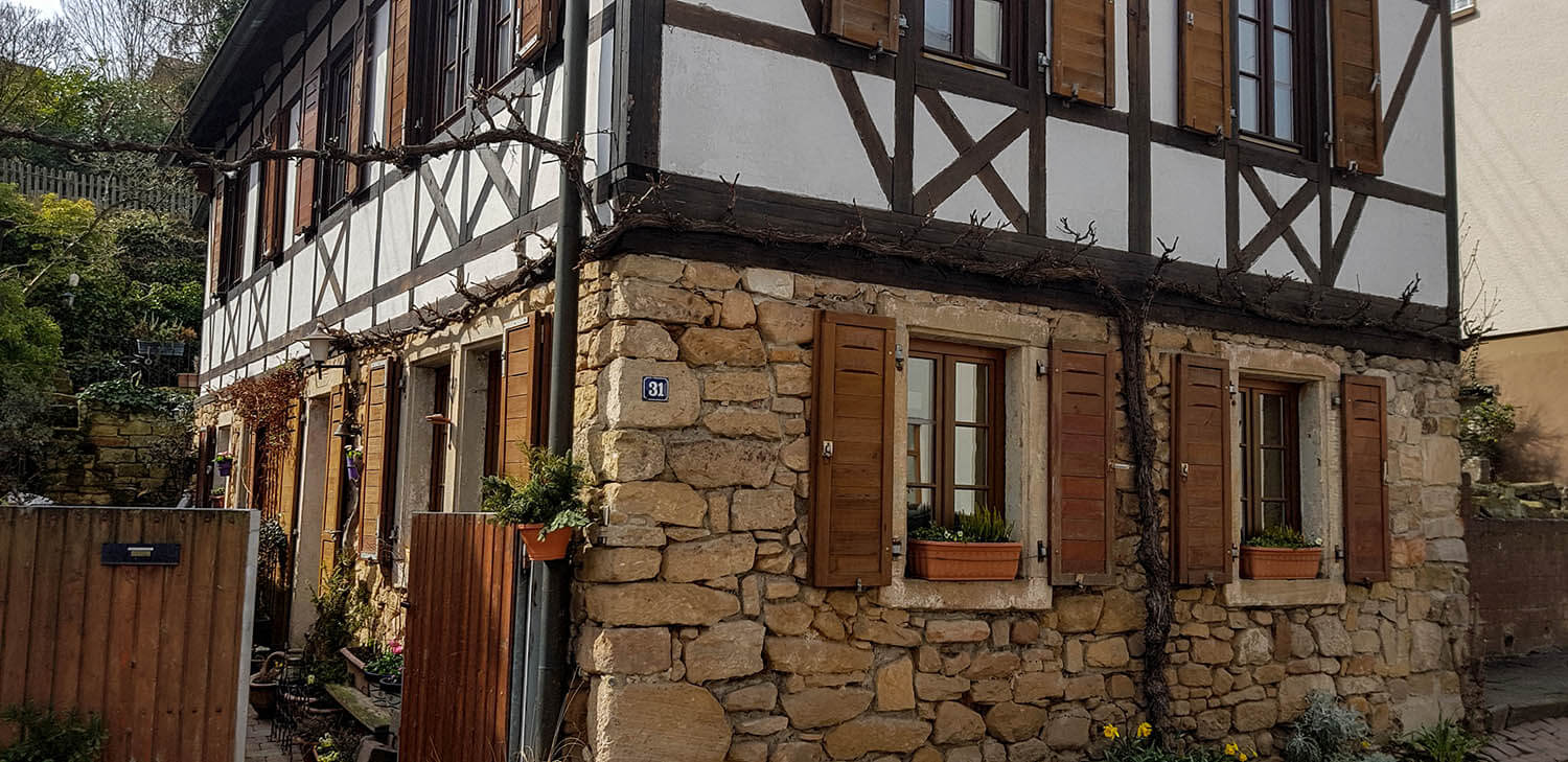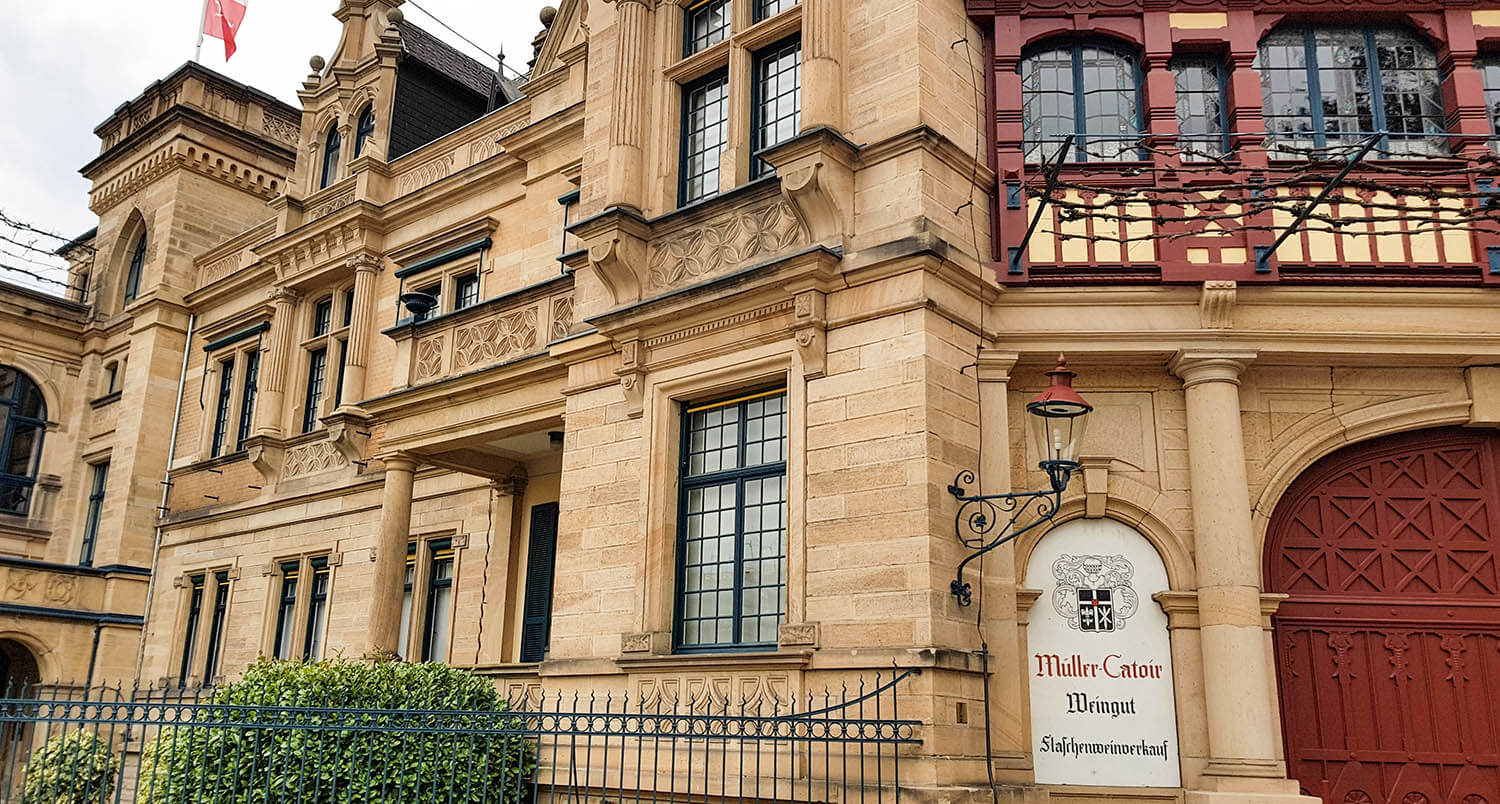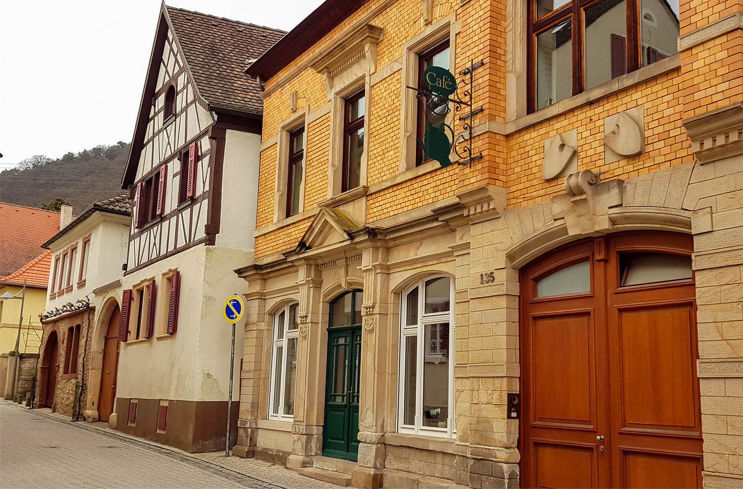 Haardt und Gimmeldingen sind pfälzische Weindörfer und seit den 70er-Jahren in Neustadt eingemeindet. Der Wein hat die Dörfer reich gemacht. Villen und Weingüter mit Wappen zeugen vom Wohlstand. Am Mandelring 25 residiert das Weingut Müller-Catoir. Das herrschaftliche Gutsgebäude im neoklassizistischen Stil fällt mir gleich ins Auge, es sieht schon ein bisschen aus wie ein Schloss. Schade, dass es heute – weil Karfreitag ist – geschlossen hat. Gerne hätte ich mir die Verkaufsräume angeschaut und von dem Spitzenwein probiert. Ein paar Schritte weiter entdecke ich gegenüber (Nr. 38) das ehemalige Weingut Mattern. Romantisch liegt es da und ein bisschen verwildert sieht es aus.