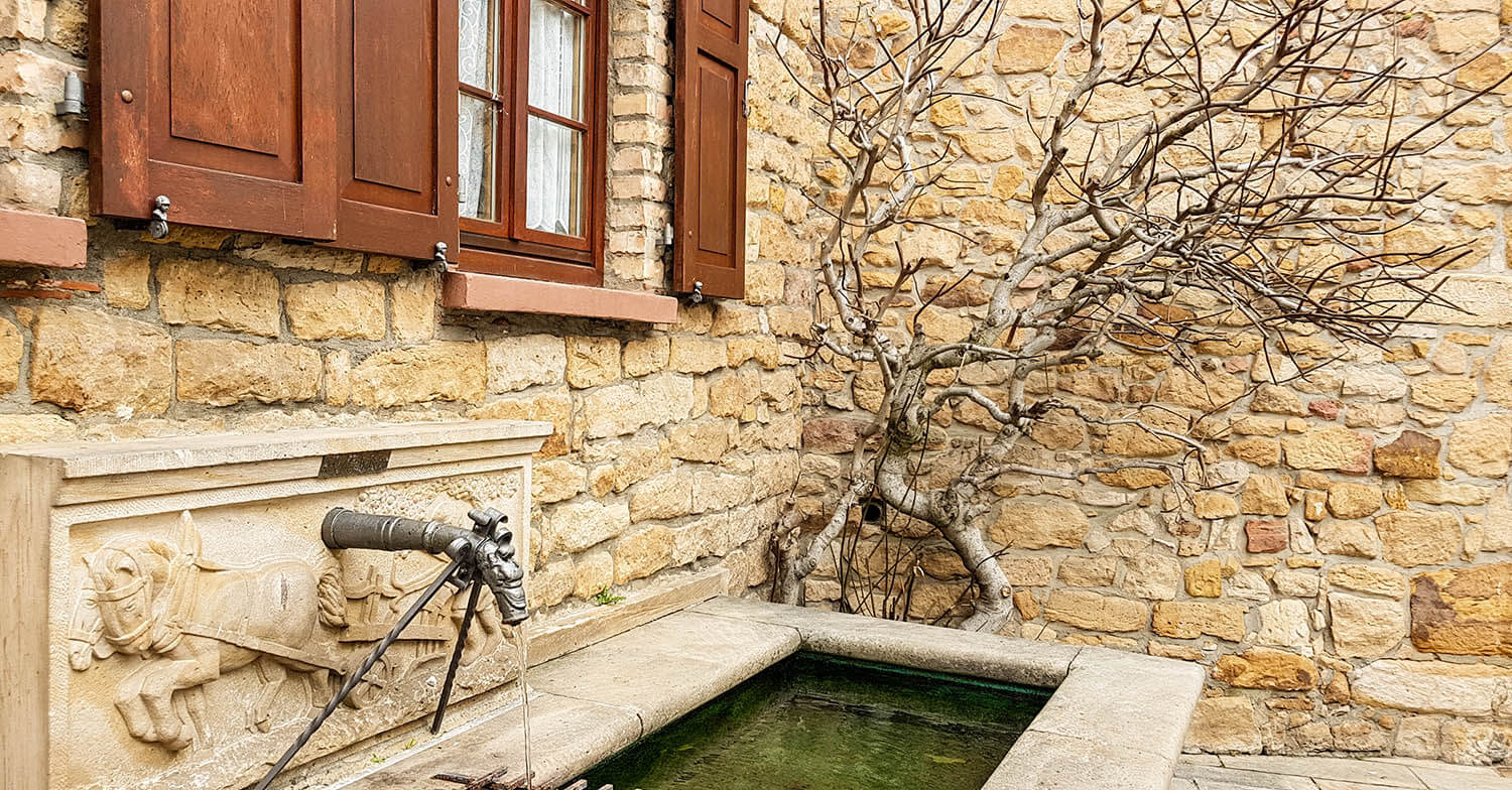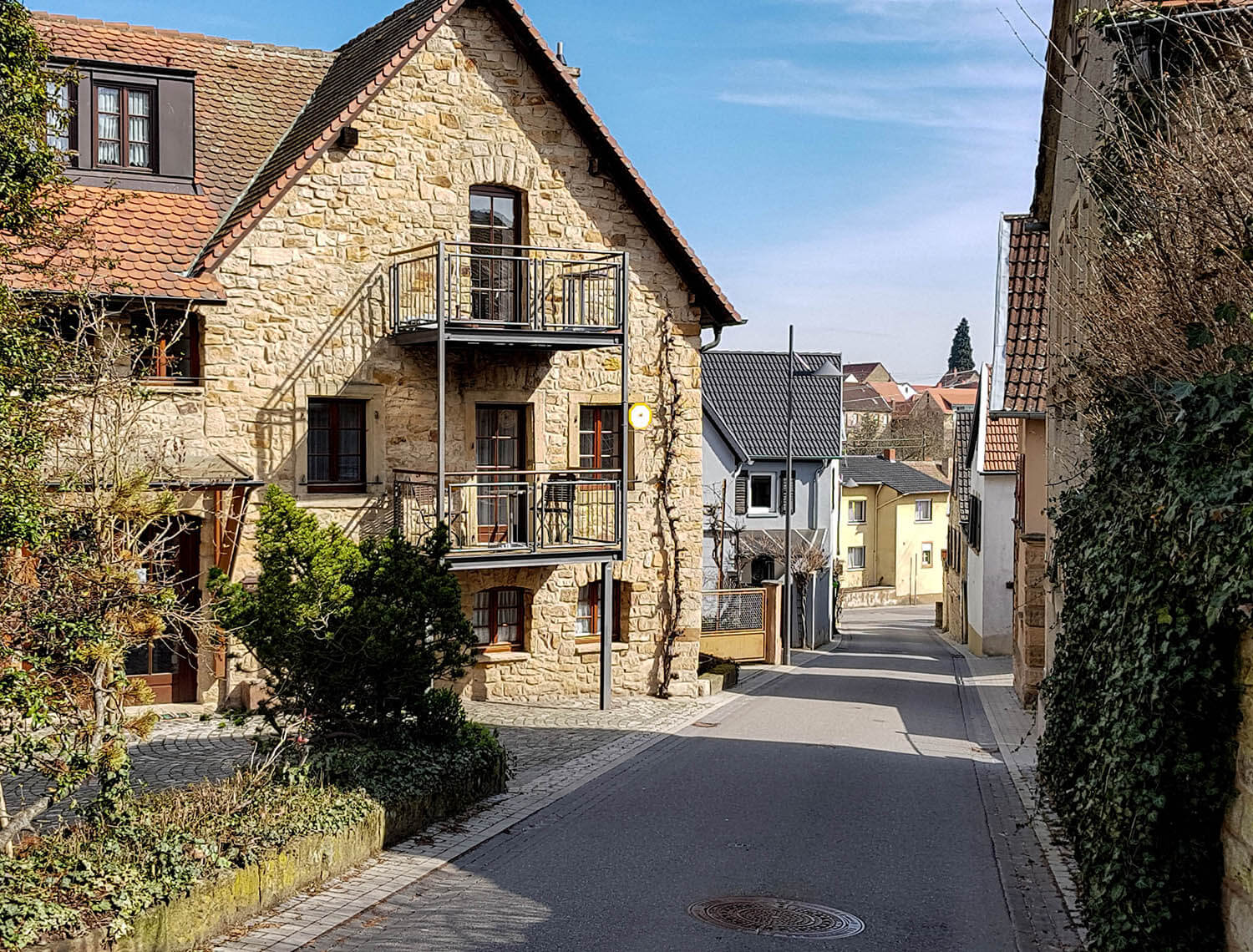Ich schlendere die Straße entlang bis zur Ortsmitte. Haardt ist ein typisches Straßendorf, es gibt viele Höfe mit kunstvoll verzierten Torschlusssteinen und idyllische Plätze mit Brunnen. Viele Häuser sind aus dem für die Gegend typischen gelb-weißen Sandstein gebaut, andere haben Fachwerk. Über dem Ort thront das Haardter Schloß und von der Rebenkanzel hat man einen weiten Blick in die Rheinebene. Ja, hier lässt es sich Leben, vorne die Weinberge und im Rücken der Pfälzer Wald.
