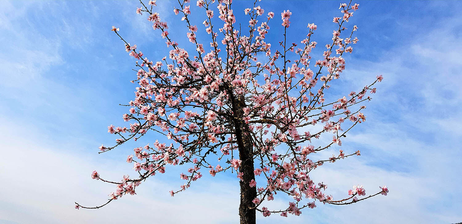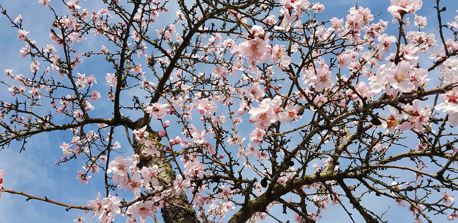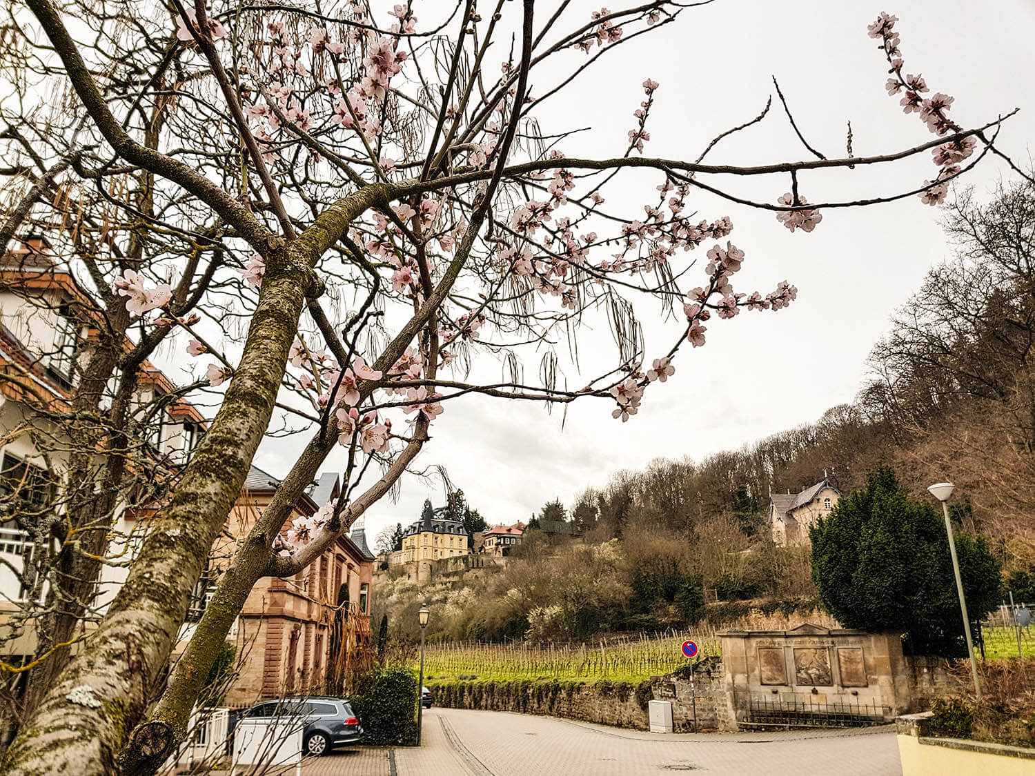 Juchhee, da sind die ersten Mandelbäume. Herrlich leuchten sie in Rosa, manche hell, andere intensiv pink und der Himmel über ihnen ist himmelblau. Die Luft ist noch kalt, doch ein bisschen riecht es schon nach Frühling. Ich bin begeistert. In Gimmeldingen blühen jedes Frühjahr Hunderte Mandelbäume und tauchen die Landschaft in ein zartes Rosa.