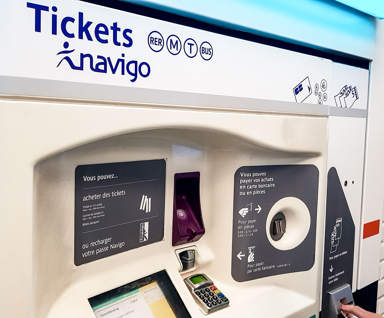 Du kaufst für 2€ die Navigo-Easy-Karte aus Plastik und lädst künftig deine Tickets darauf. Wenn du am Gare de l‘ Est oder Gare du Nord ankommst, sind die Ticketschalter meist sehr frequentiert und die Warteschlangen lang. Hast du schon die Karte, kannst du gleich zum Automaten. Der „spricht“ übrigens deutsch, wenn du die Menüführung entsprechend einstellst. Beachte bei den Automaten, dass nicht alle Geldscheine annehmen.