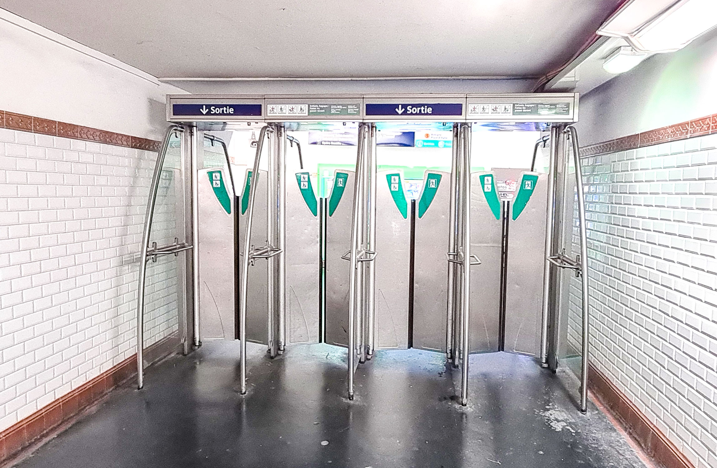 Um rauszukommen, folgst du immer den Hinweisen „Sortie“ = Ausgang. Die Türen öffnen automatisch oder durch Wegdrücken mit der Hand. Für den Ausgang benötigst du dein Ticket nicht.