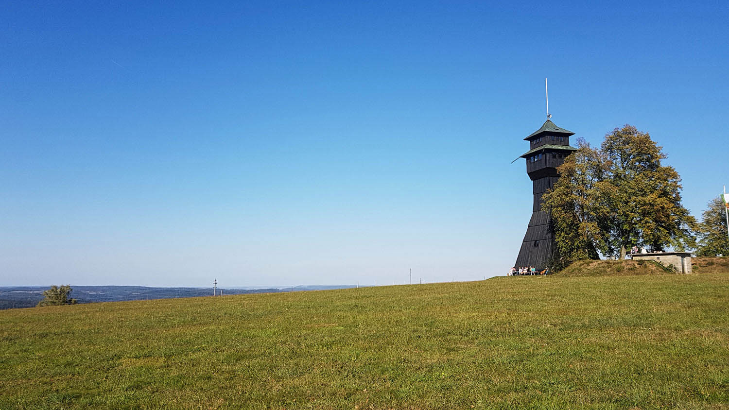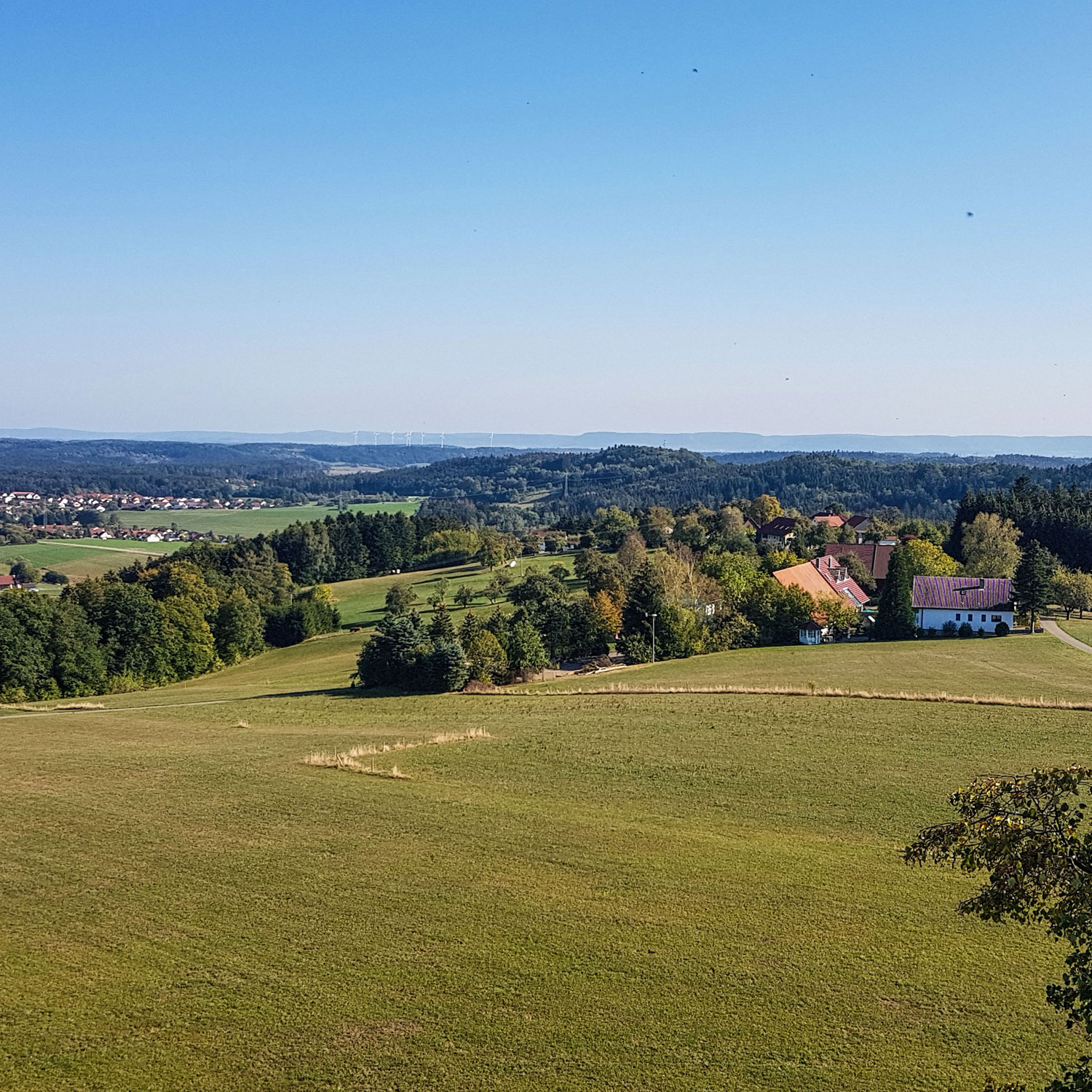 Ich unterhalte mich mit einem älteren Ehepaar, das regelmäßig hier hochkommt. Sie erklären mir, was es alles zu sehen gibt: Richtung Norden die Hohenloher Ebene, die A6 mit der Kochertalbrücke, westlich die Löwensteiner Berge und im Süden die Ostalb mit den Drei-Kaiserbergen, Hohenstauffen und Hohenneuffen.