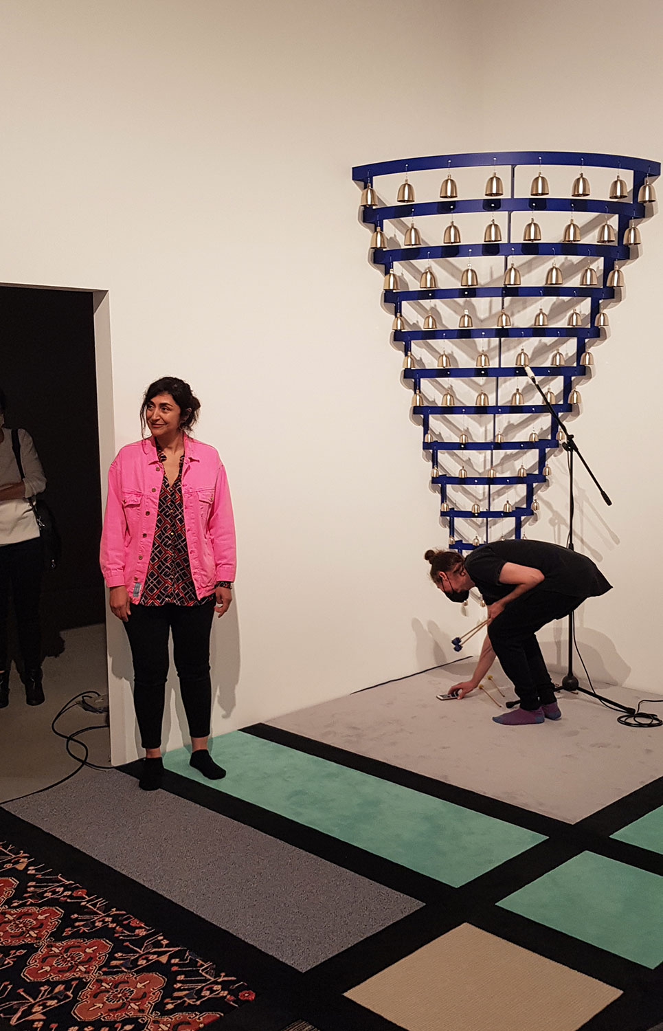 Skulpturen und Installationen bilden das abschließende Kapitel der Ausstellung. Die deutsch-türkische Künstlerin Nevin Aladag lässt uns im „Resonanz-Raum“ über einen Soundteppich aus Quadraten schreiten und schafft Klangkörper, die man sehen und hören kann.