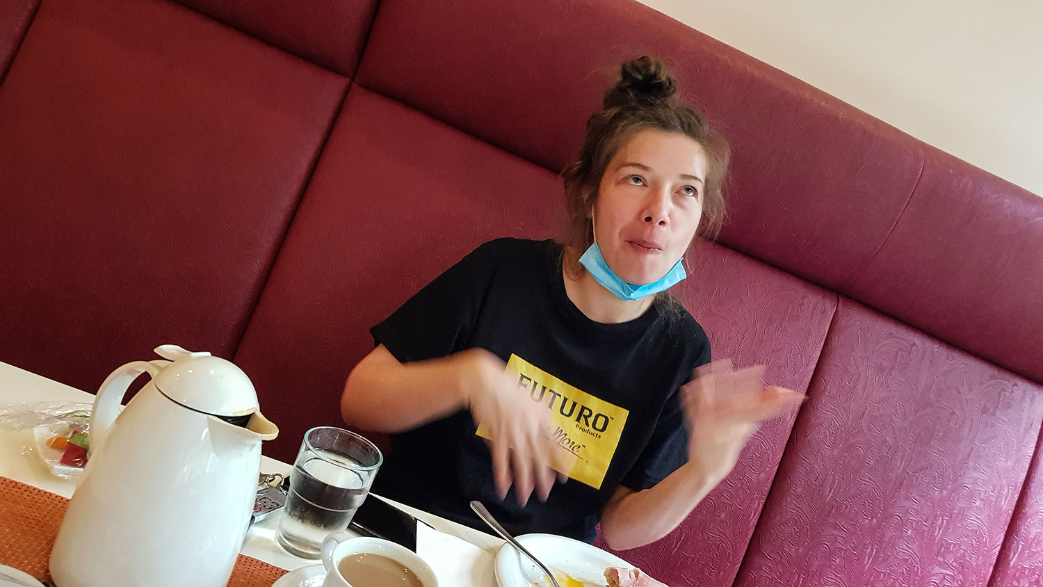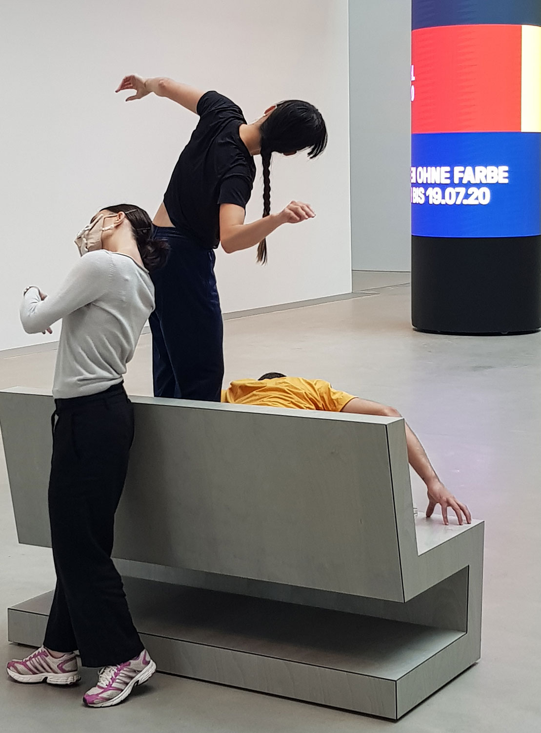 Zufällig haben die Künstler und ich im selben Hotel übernachtet. Und so hatte ich Gelegenheit beim Frühstück mit Alexandra Pirici noch ein paar Worte zu wechseln: Über Kunst, Corona und das Geld. Leider war ihre Performance nur während der Eröffnungswoche zu sehen. Trotz zahlreicher Sponsoren der Kunsthalle, war für weitere Auftritte kein Budget vorhanden. Es gibt auch keine Videos von den Performances, die später eingespielt werden. Das scheint Teil ihres Konzepts zu sein.