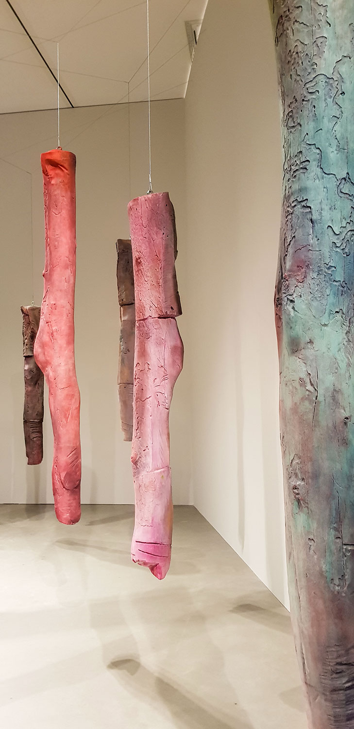 Wie Schweinehälften in der Fleischfabrik baumeln „Mother`s Legs“ von Kaari Upson im Raum. Und die chinesische Künstlerin Hu Xiaoyuan geht der Frage „Was ist Körper, was ist Hülle“ nach und zeigt filigrane Skulpturen, die mit Rohseide bespannt wurden.