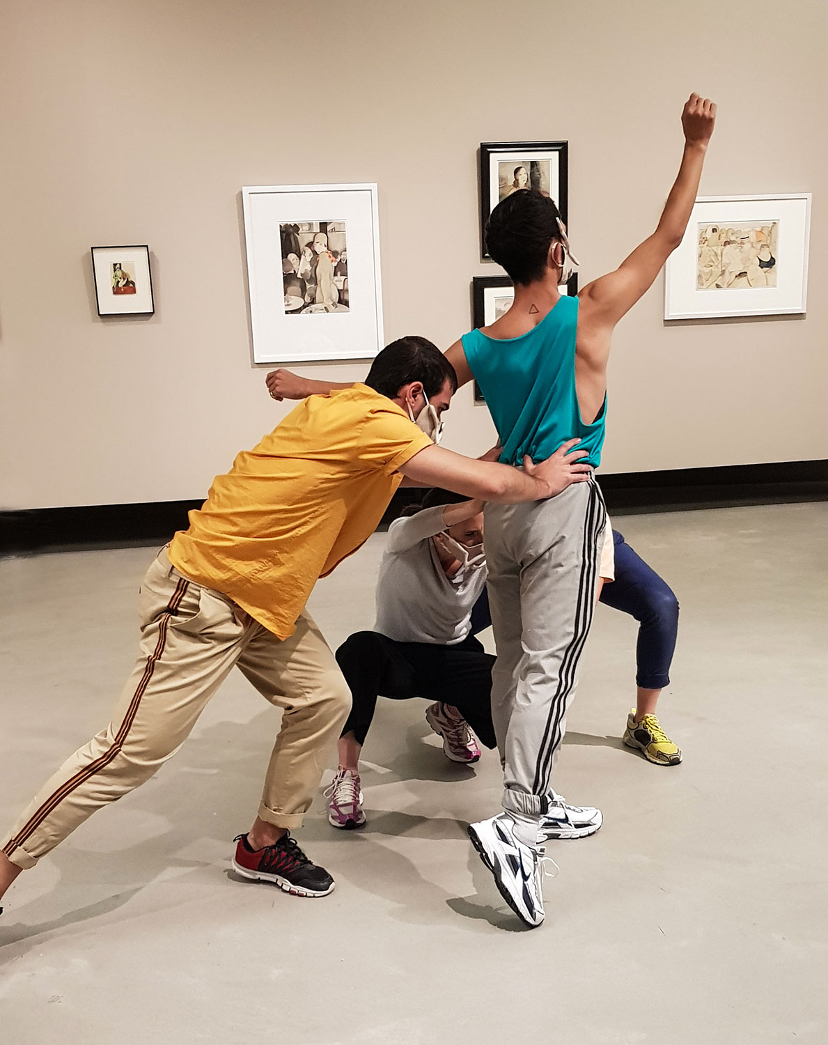 Doch dann kommt Bewegung in den Saal. Scheinbar aus dem Publikum heraus, kriechen und posieren Menschen vor den Gemälden. Sie tragen Masken, tanzen durch den Raum und verharren einzeln oder in Gruppen vor einem Gemälde und lösen sich später wieder auf. Mit einer Ongoing Performance schlägt die rumänische Künstlerin Alexandra Pirici die Brücke von den Umbrüchen der Weimarer Republik in die Gegenwart. „Re-Collection“ heißt die Arbeit, die sie mit Tänzerinnen und Tänzern aus Mannheim visualisiert. Eigens entworfene Masken vor Mund und Nase verdeutlichen, wie die aktuelle Corona-Pandemie auch in die Kunst vordringt.