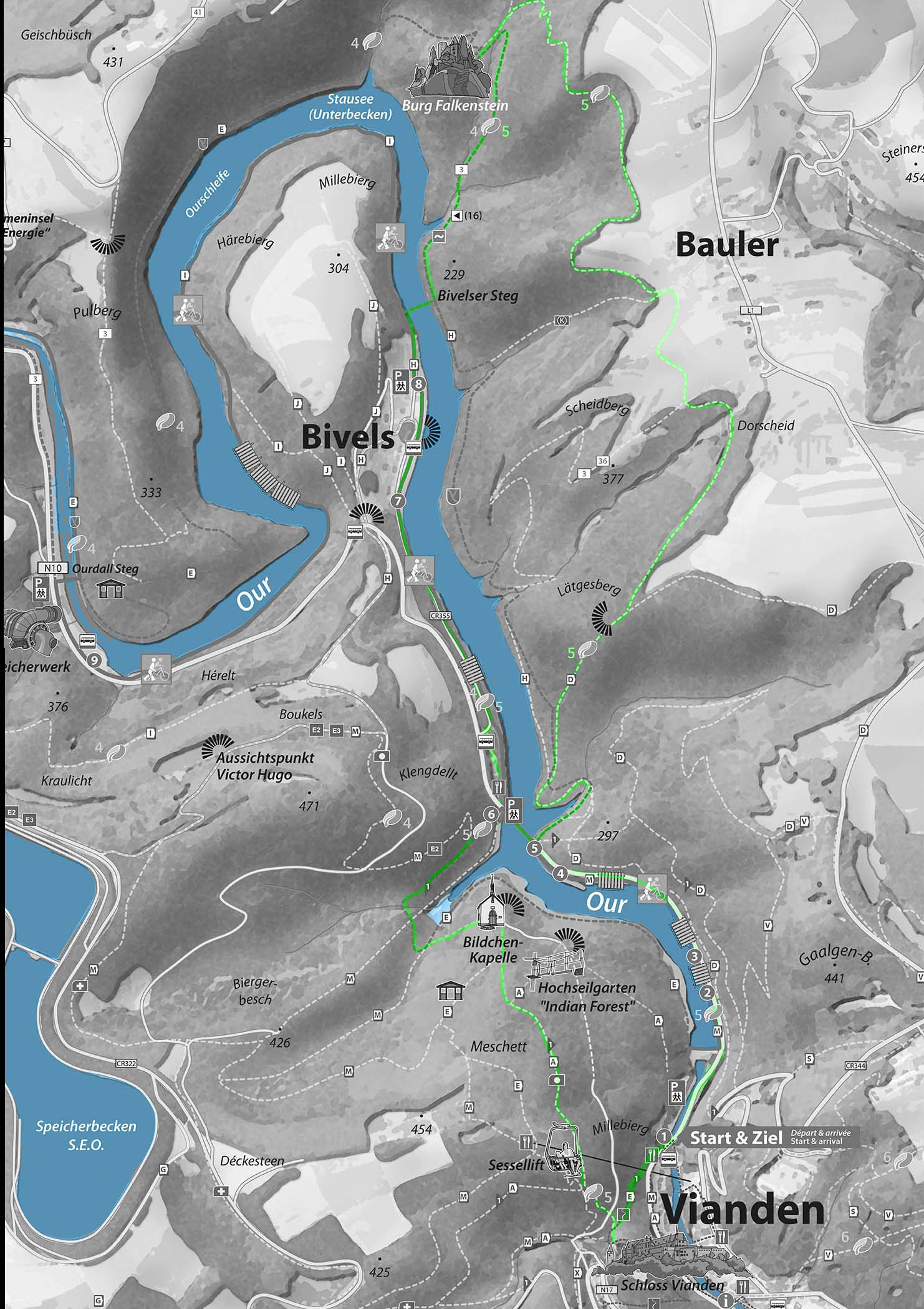 | Sonstiges | Premiumwanderweg, kostenlose Besichtigung des nahegelegenen Pumspeicherwerks möglich, Sessellift zum Schloss Vianden; Spezialitäten der Region: Ardenner Schinken und Nusslikör | ||