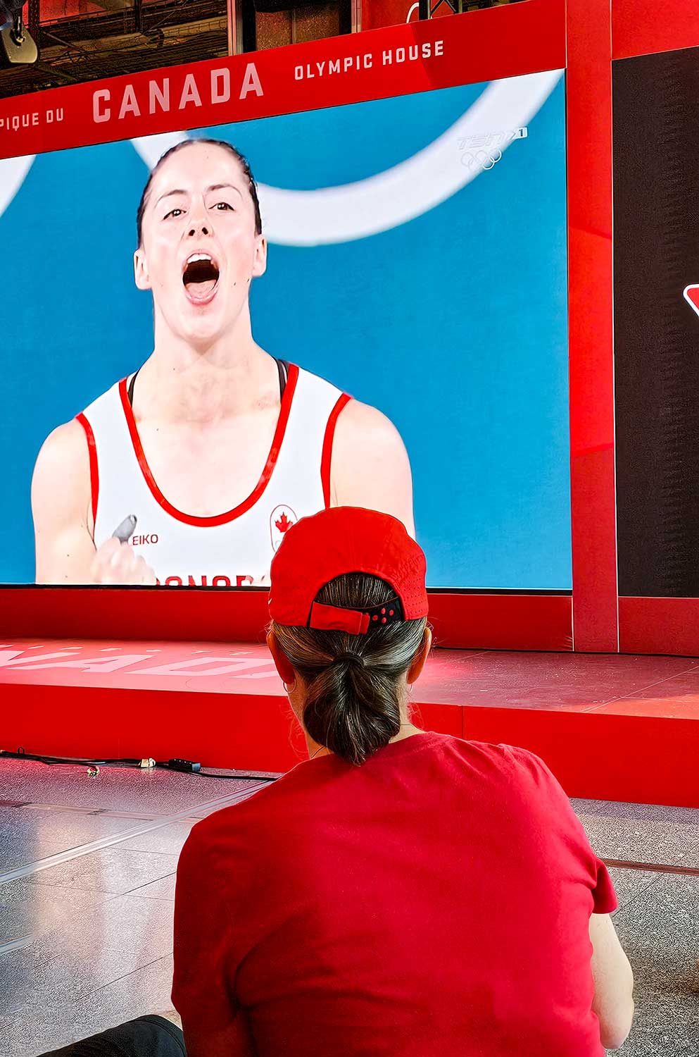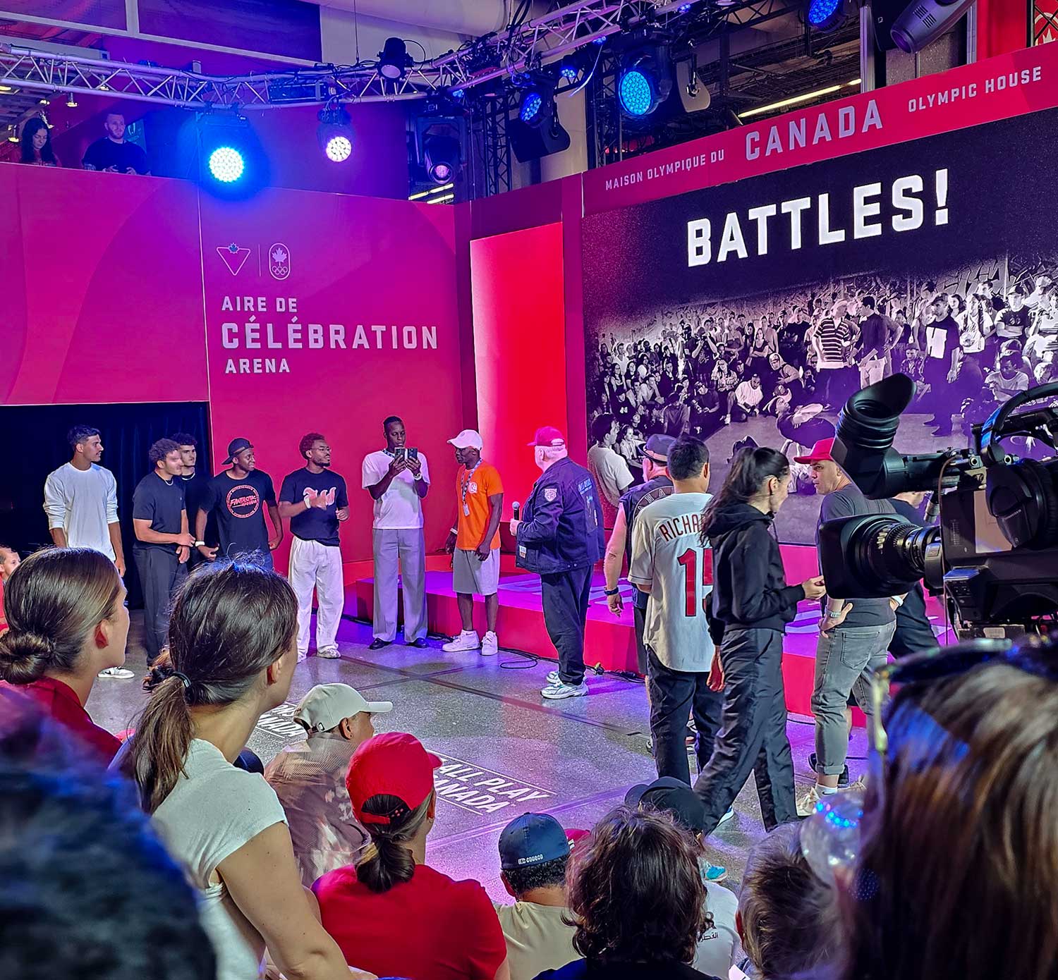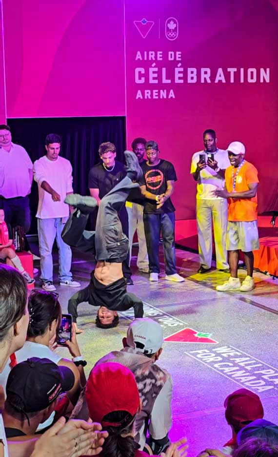 Szenenwechsel: Wenn ich an Sportarten in Kanada denke, kommen mir spontan Eishockey, Football oder Golf in den Sinn. Breakdance hätte ich nicht erwartet. Doch der kanadische B-Boy Philip Kim alias Phil Wizard gewann am 10. August die Goldmedaille im Breaking bei Olympia 2024 in Paris. Einen Vorgeschmack auf das Breaking erlebte ich am Donnerstag im Olympic Canada House. Zur Musik von „Ain’t No Stoppin‘ Us Now“ zeigten eine Frau und mehrere junge Männer ihre beeindruckenden Moves, angefeuert von zwei älteren Herren der Szene, den Canadian Floormasters (CFM). Schade, dass Breaking als olympische Disziplin nur diesen einmaligen Auftritt in Paris hatte.