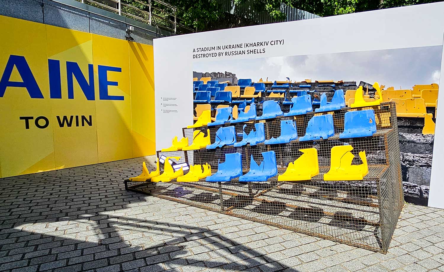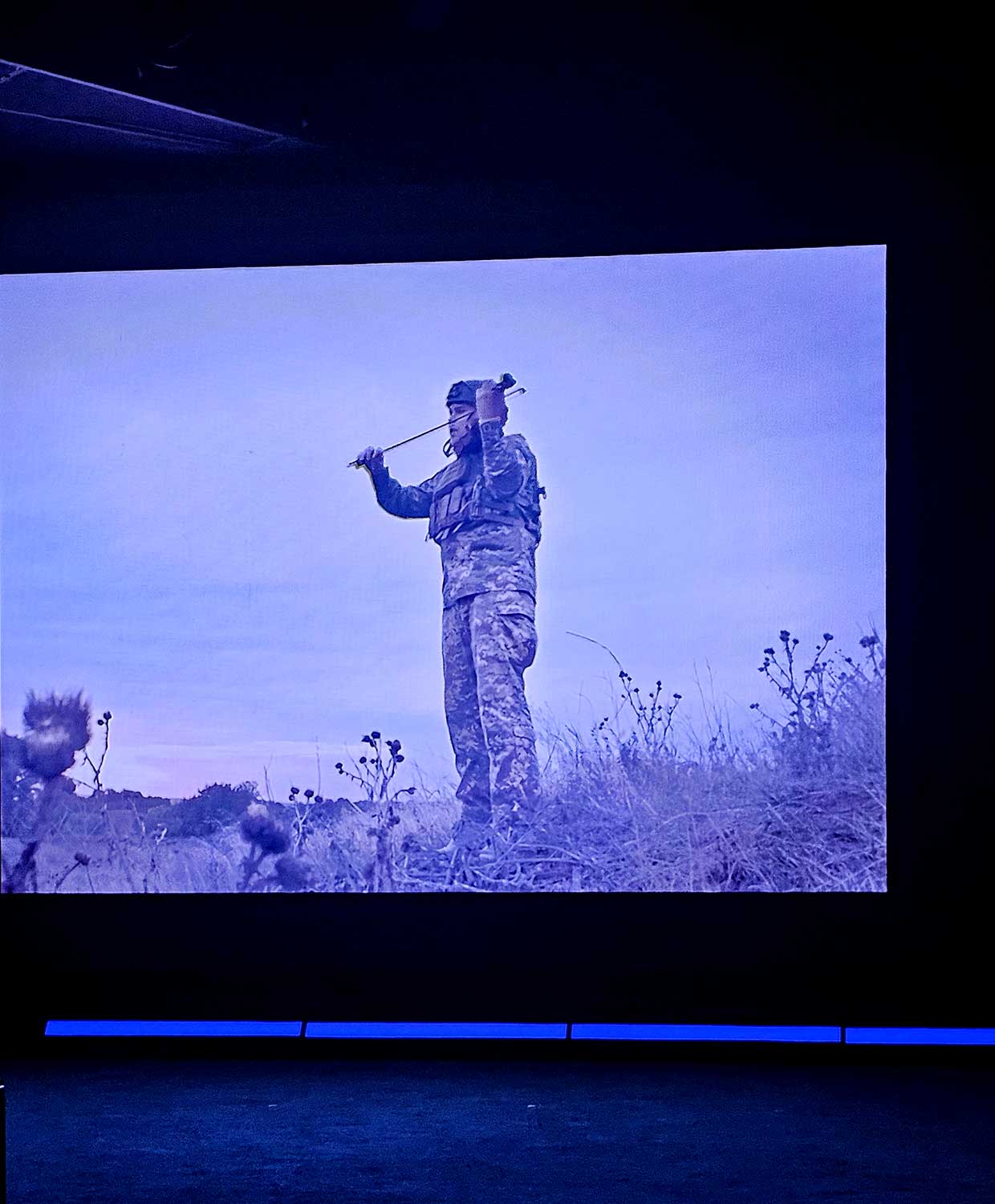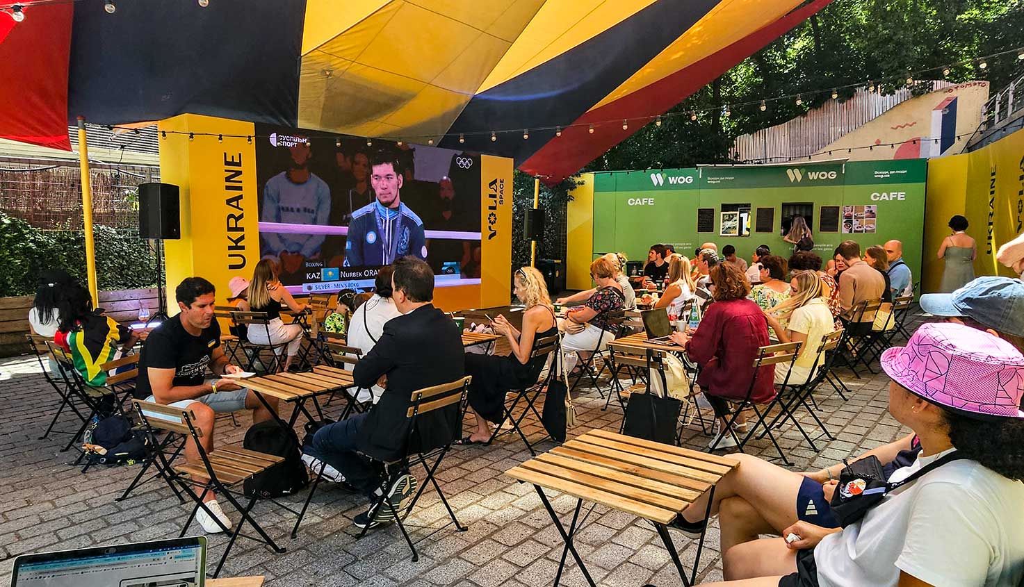 Als erstes besuchte ich den Pavillon der Ukraine. Er war relativ klein, gut versteckt und noch besser bewacht. Ruhig und beschaulich ging es dort zu. Auf dem Screen wurde gerade das Gewichtheben der Frauen (bis 59 kg) mit der Ukrainerin Kamila Konotop übertragen. Im Inneren des Pavillons spielte ein Musiker auf der Geige, und anschließend lief ein Dokumentarfilm des französischen Publizisten und Journalisten Bernard-Henri Lévy. Der Film zeigt verschiedene Schauplätze an der Kriegsfront. Für eine halbe Stunde ließ ich mich darauf ein und war plötzlich gedanklich ganz weit weg von Olympia, mitten im Kriegsgeschehen zwischen Ukrainern und Russen. Ich sah Soldaten in Schützengräben, Drohnenmanöver und einstürzende Häuser.