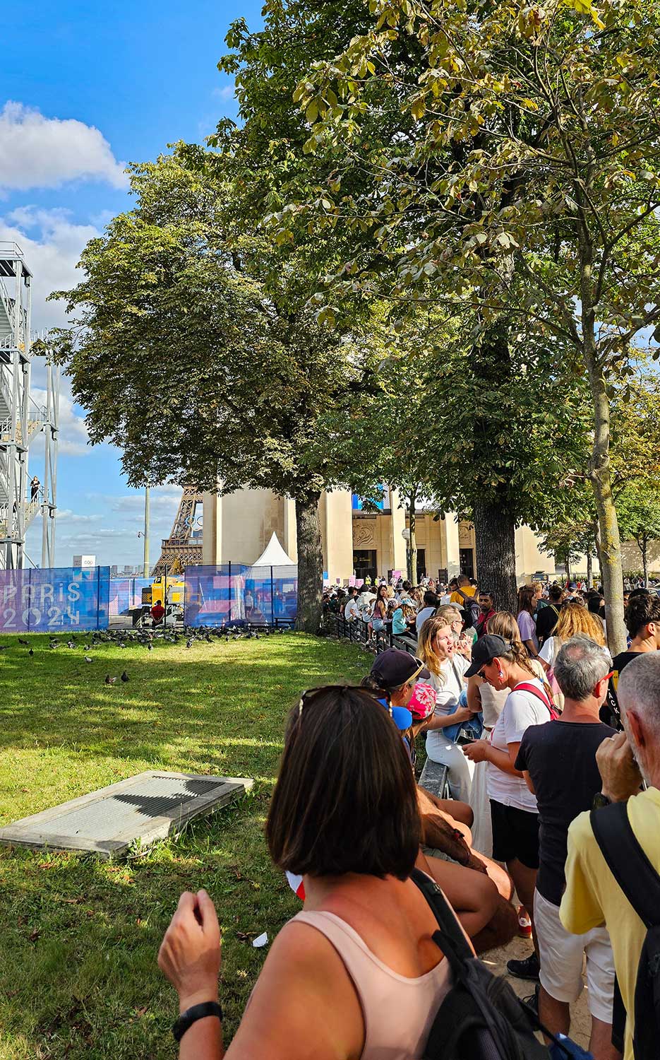 Dazu wechselte ich an der Haltestelle Oberkampf von der Linie 5 in die 9, mit der ich bis zur Metrostation Léna fuhr. Sie liegt ideal zwischen dem Trocadéro und dem Eiffelturm. Schon am Treppenaufgang der Metro wurden wir von hilfsbereiten Freiwilligen freundlich empfangen und direkt zum Haupteingang des Champions-Park geleitet. Leider war die Arena gerade voll (zur Orientierung: sie fasst 13.000 Personen), sodass wir etwa eine Stunde auf den Einlass warten mussten. Doch die Stimmung war fantastisch – alle waren gut gelaunt, entspannt und keineswegs ungeduldig oder aggressiv. Ich beobachtete meine Nachbarn zu beiden Seiten und versuchte zu erraten, woher sie kamen – Deutsche, Franzosen, Italiener, Japaner…