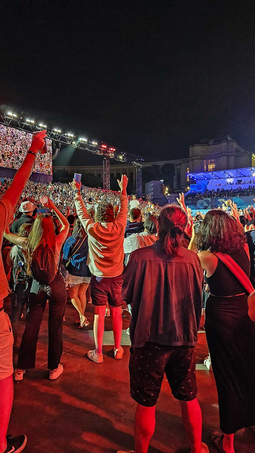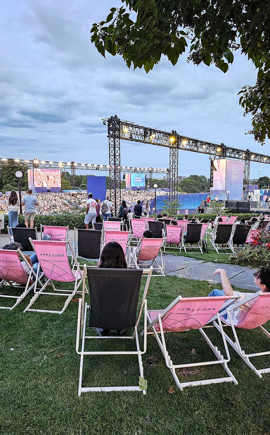 Der Parc des Champions war wirklich genial ausgewählt und die perfekte Kulisse. Ich beschloss, bis zum Sonnenuntergang im oberen Bereich zu bleiben, deckte mich mit Bier und Snacks ein und fand einen Liegestuhl in der ersten Reihe mit freiem Blick auf einen großen Bildschirm.