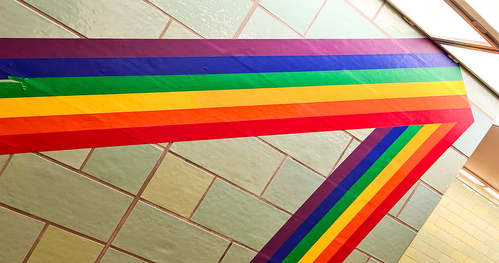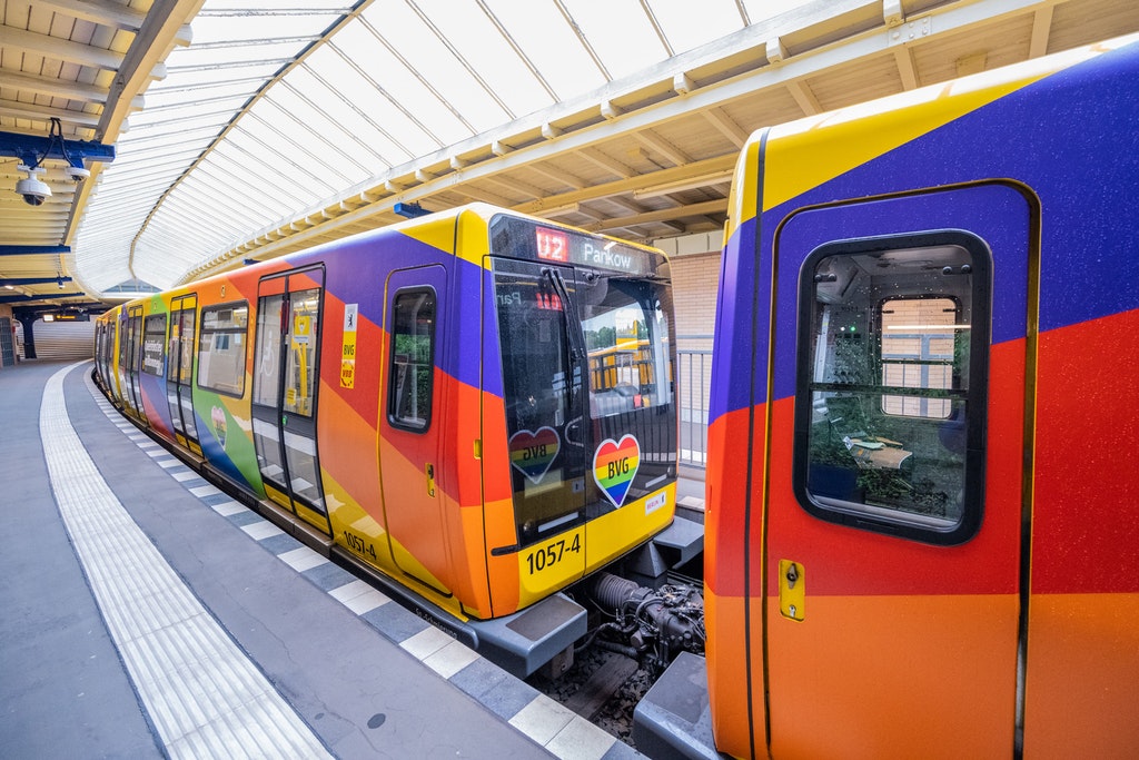 Den ganzen Juli über verwandelt sich der U-Bahnhof Alexanderplatz in eine große Regenbogen-Installation, 80 Straßenbahn- und Bushaltestellen wurden beklebt und auf der U2 fährt ein Regenbogenzug.