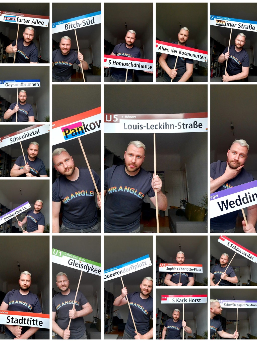 Mehr als 270 Mitarbeiter der BVG engagieren sich aktiv dafür, der LGBTIQ*-Community in der BVG ein Gesicht zu geben. Den Abschluss der Aktivitäten feiern sie an diesem Samstag (24.7.2021) mit der Teilnahme am Christopher Street Day (CSD) . Für den Umzug wurden besondere Haltstellen-Schilder kreiert: So heißt Wuhletal nun Schwuhletal, aus Stadtmitte ist Stadttitte geworden, Hohenschönhausen wird zu Homoschönhausen. Auf dem Foto seht ihr Dominik Reiter, den Sprecher des Regenbogen-Netzwerk der BVG, mit den Haltstellenschildern.
