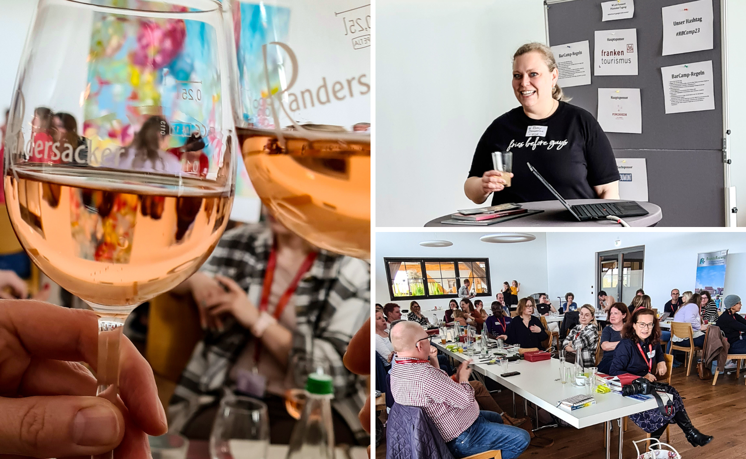 Zum Abschluss des samstäglichen Barcamp-Tages wartete dann noch ein weiteres Highlight auf uns. Eine Weinverkostung mit der Weinprinzessin Linda. Denn Franken ist neben dem Bier auch für seine Weine sehr bekannt. Secco, Silvaner und Sauvignan Blanc mundeten köstlich. Lohnenswert ist sicherlich auch ein Besuch der magischen Weinorte „terroir f“, die mit viel Weitblick und interessanter Architektur punkten. Jörg vom Tourismusverband Franken fasste in seinem Vortrag noch einmal die Franken-Highlights 2023 zusammen und stellte uns die neue Kampagne zur Nachhaltigkeit vor.