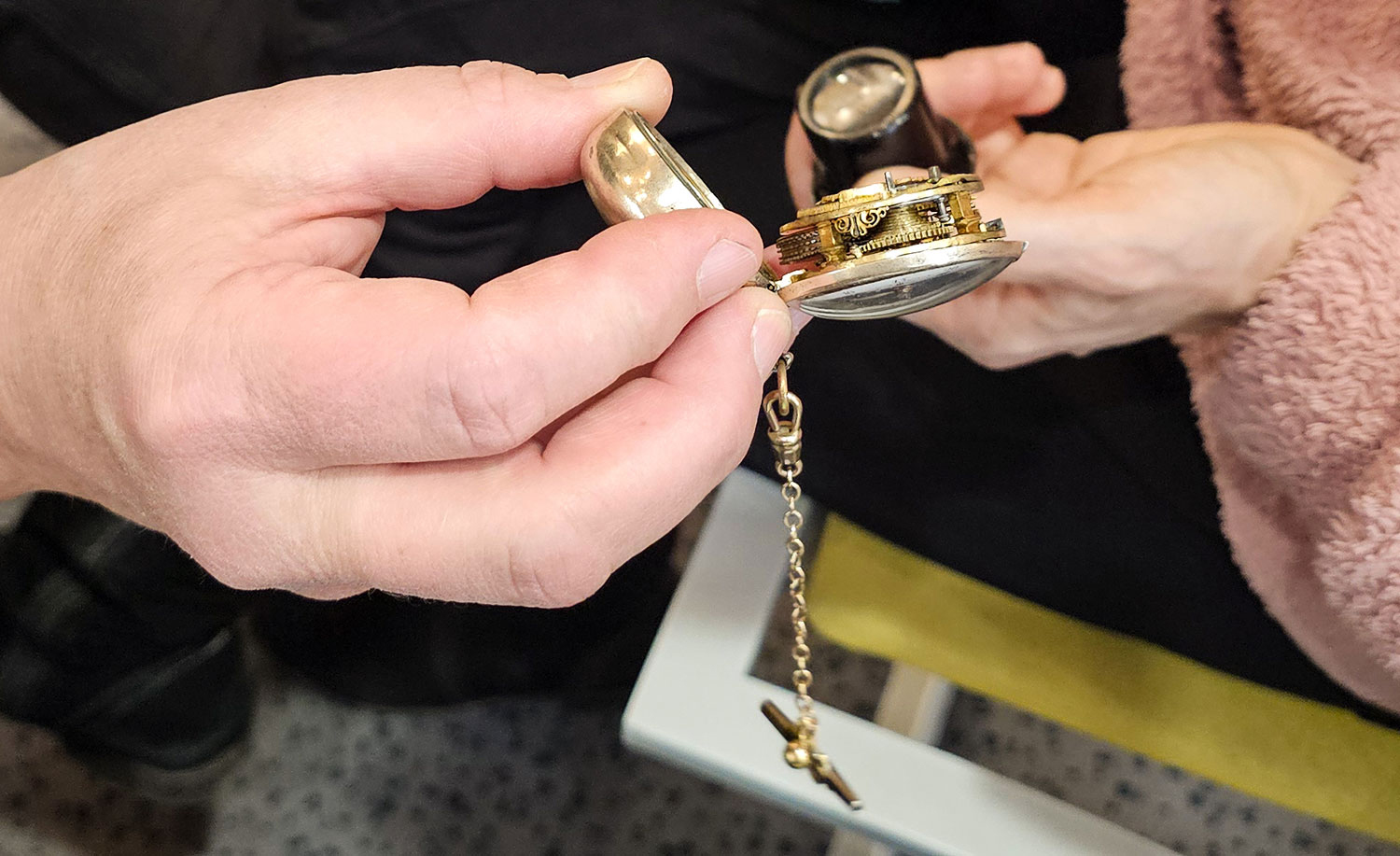 Zunächst erklärt sie, wie eine mechanische Uhr überhaupt funktioniert: das Zusammenspiel von Räderwerk, Anker und Pendel. Aha – in den Grundzügen verstanden. Dann spannt sie den Bogen von den großen Kirchturm- und Standuhren zu den Taschenuhren. Filigranste Handarbeit, das Zusammensetzen einer solchen Uhr, die immer komplexeren Komplikationen, je aufwendiger das Werk wurde. Schließlich erfuhren wir auch, wie sich die Taschenuhr zur Armbanduhr wandelte.
