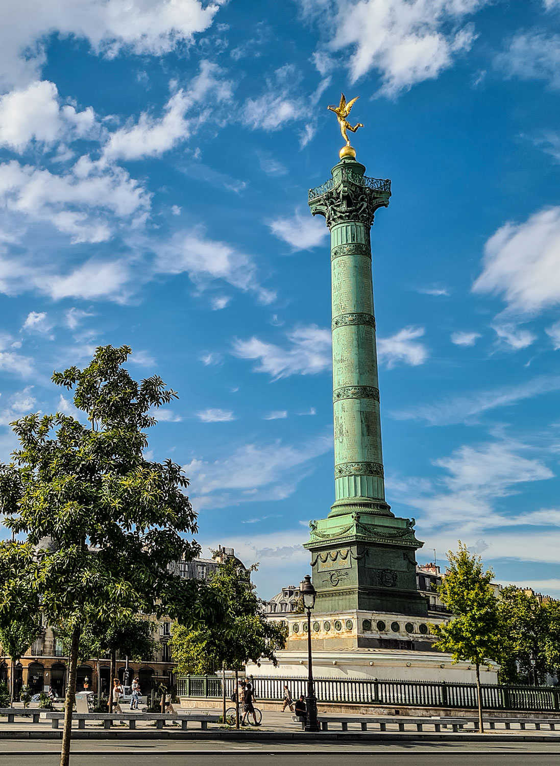 Wir lassen jetzt den Canal hinter uns und fahren vier Stationen weiter bis zur Bastille. Unten – in der Metrostation – erinnern Mauerreste an das ehemalige Gefängnis und oben strahlt der goldene Freiheitsengel auf der Julisäule vor dem blauen Himmel. Vom Place de la Bastille sind es nur ein paar Schritte bis zum Place des Vosges.