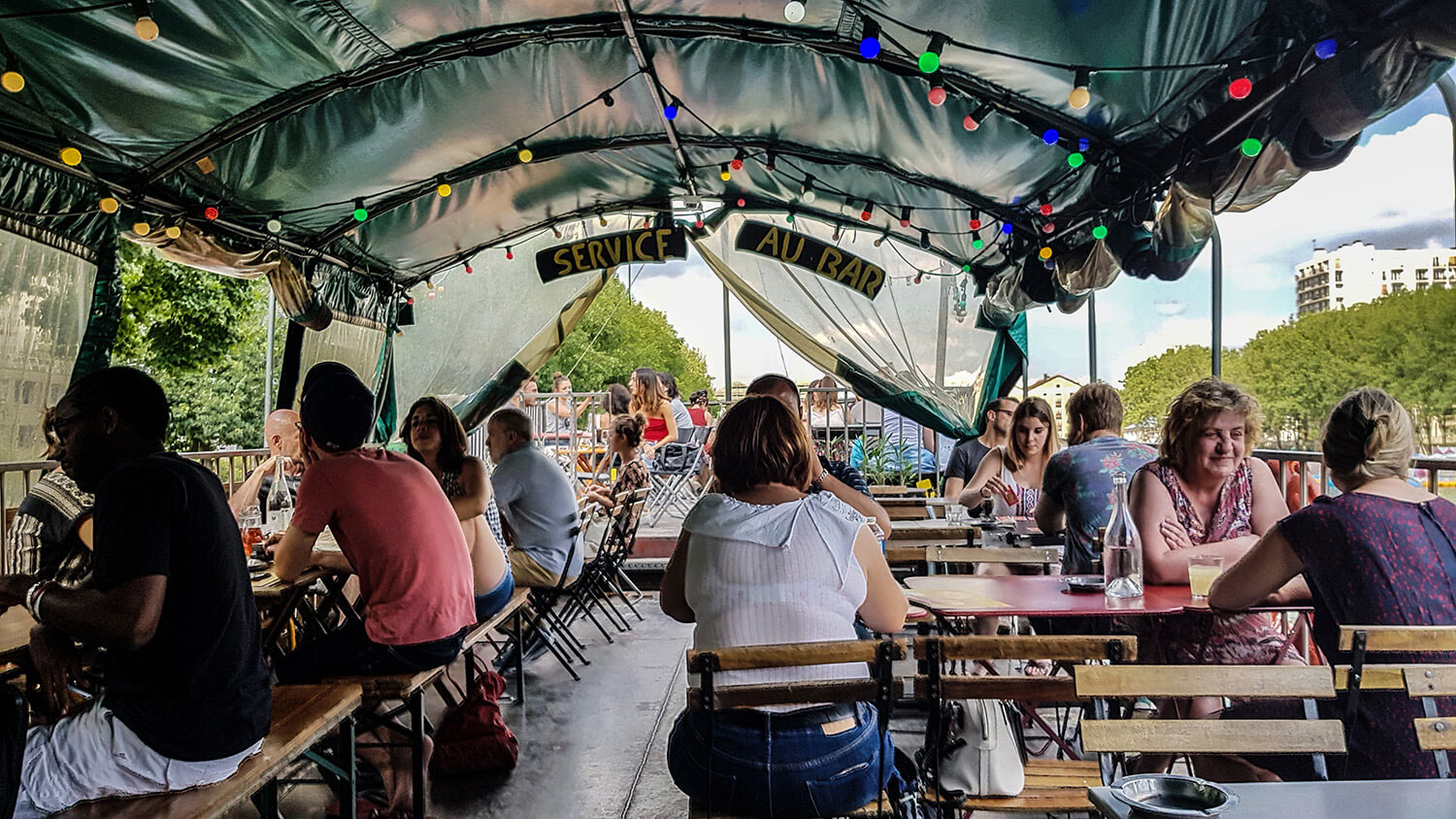 Doch stop, bleiben wir noch einen Moment auf dieser Seite. Am Seine-Ufer liegen schwimmende Restaurantschiffe. Vom „Le Mazette“ klingt chillige Musik. Junges Szenevolk bevölkert das Boot. Mit einem Mixgetränk in der Hand lässt sich der Sonnenuntergang über der Seine besonders schön beobachten. Danach kannst du bis tief in die Nacht auf dem Kahn abfeiern…