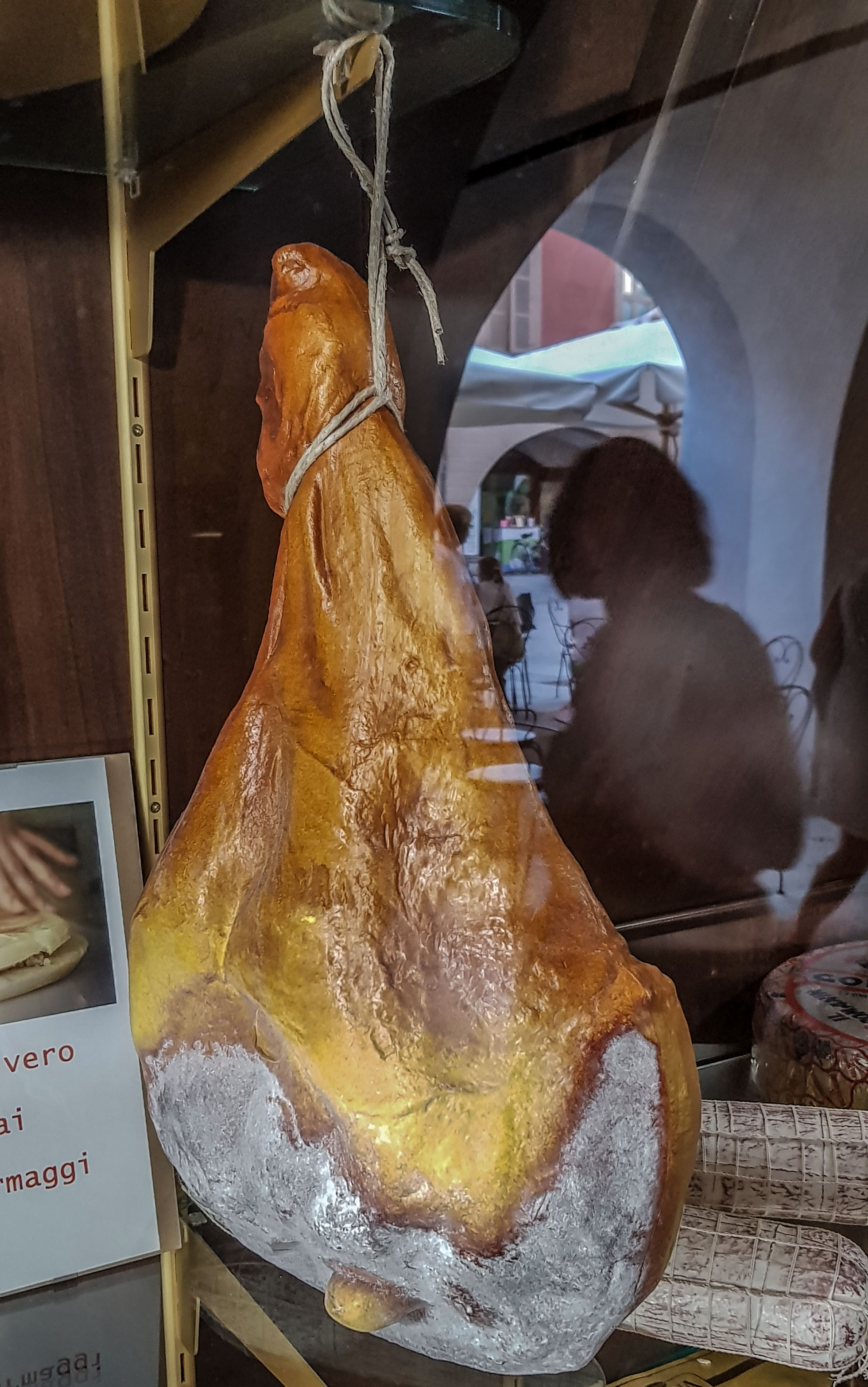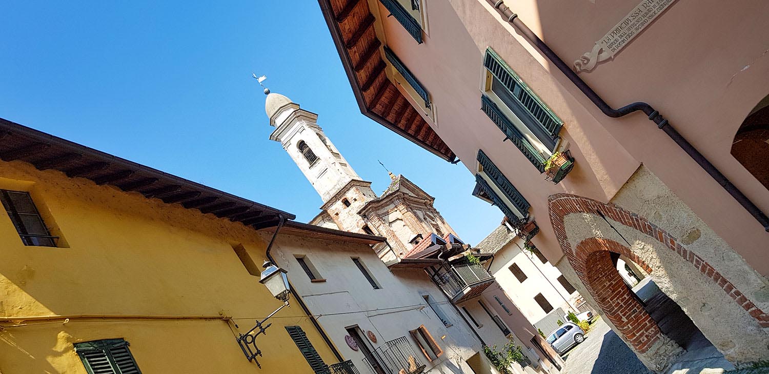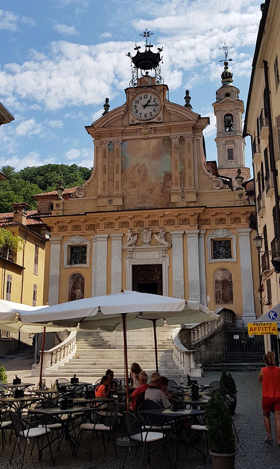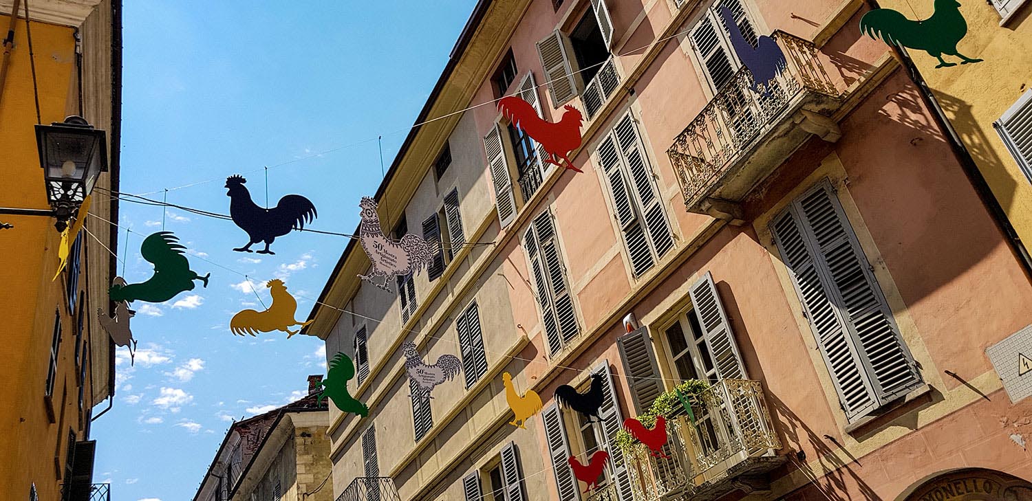 Am späten Vormittag mache mich auf den Weg von der Küste zurück ins Piemont. Mondovi liegt auf einem Hügel und ist schon von der Autobahnabfahrt zu sehen. Ich fahre unter dem Eisenbahnviadukt hindurch und am Kreisverkehr links Richtung Zentrum. Es ist Mittag, heiß, und die Straßen sind leer gefegt. Nur hier und da sitzen ein paar Einheimische beim Essen. Hunger habe ich noch nicht, aber ein kleines Eis geht immer – mit dem in der Hand schlendere ich durch die Gassen. Sie sind mit bunten Girlanden geschmückt: Hähne in allen Farben schaukeln an den Seilen, die gefallen mir.