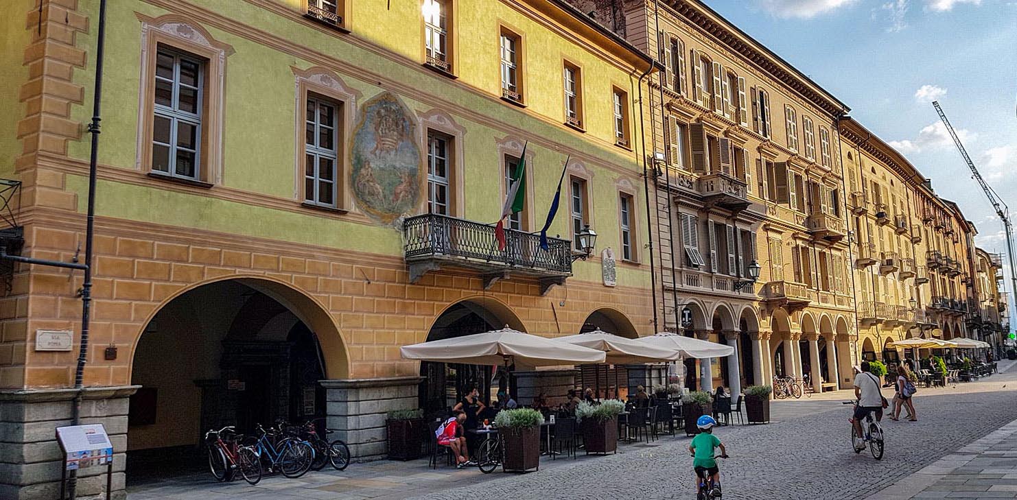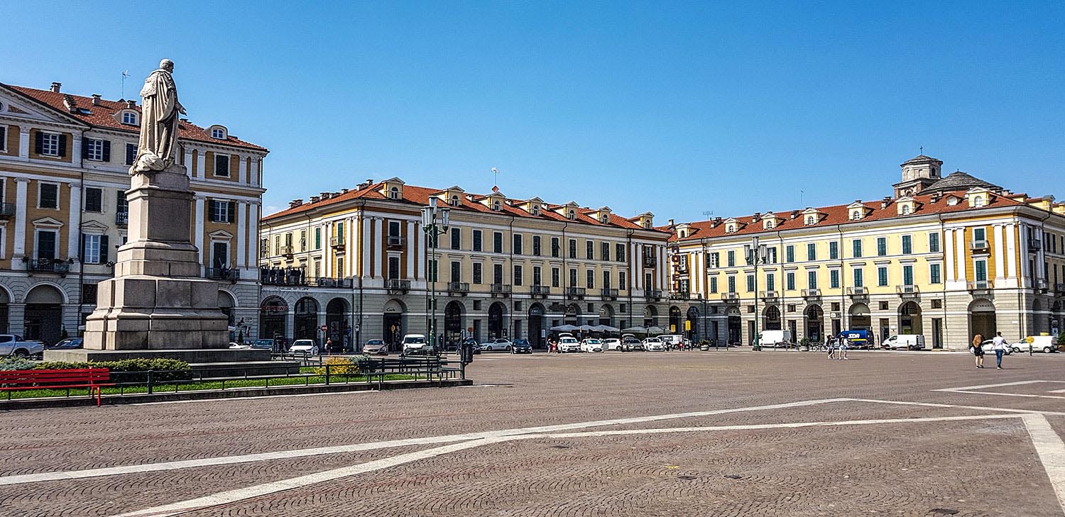 Hinter Peveragno wendet sich die Straße von den Bergen ab und führt in die Ebene. Die SP5 endet im Vorort Spinetta. Jetzt ist es nicht mehr weit bis ins Zentrum von Cuneo. Dort überrascht mich erst einmal dieser immens große und weite Platz. Die Piazza Galimberti ist 24000 m² groß, solche Ausmaße und solch eine Symmetrie hätte ich in Paris aber nicht hier erwartet. Auf der Piazza wird mir auch klar, warum das Land Piemont, „zu Füßen der Berge“, heißt: Vor mir liegen die Altstadt und die Ebene und hinter meinem Rücken bauen sich die Alpen wie eine Wand auf.