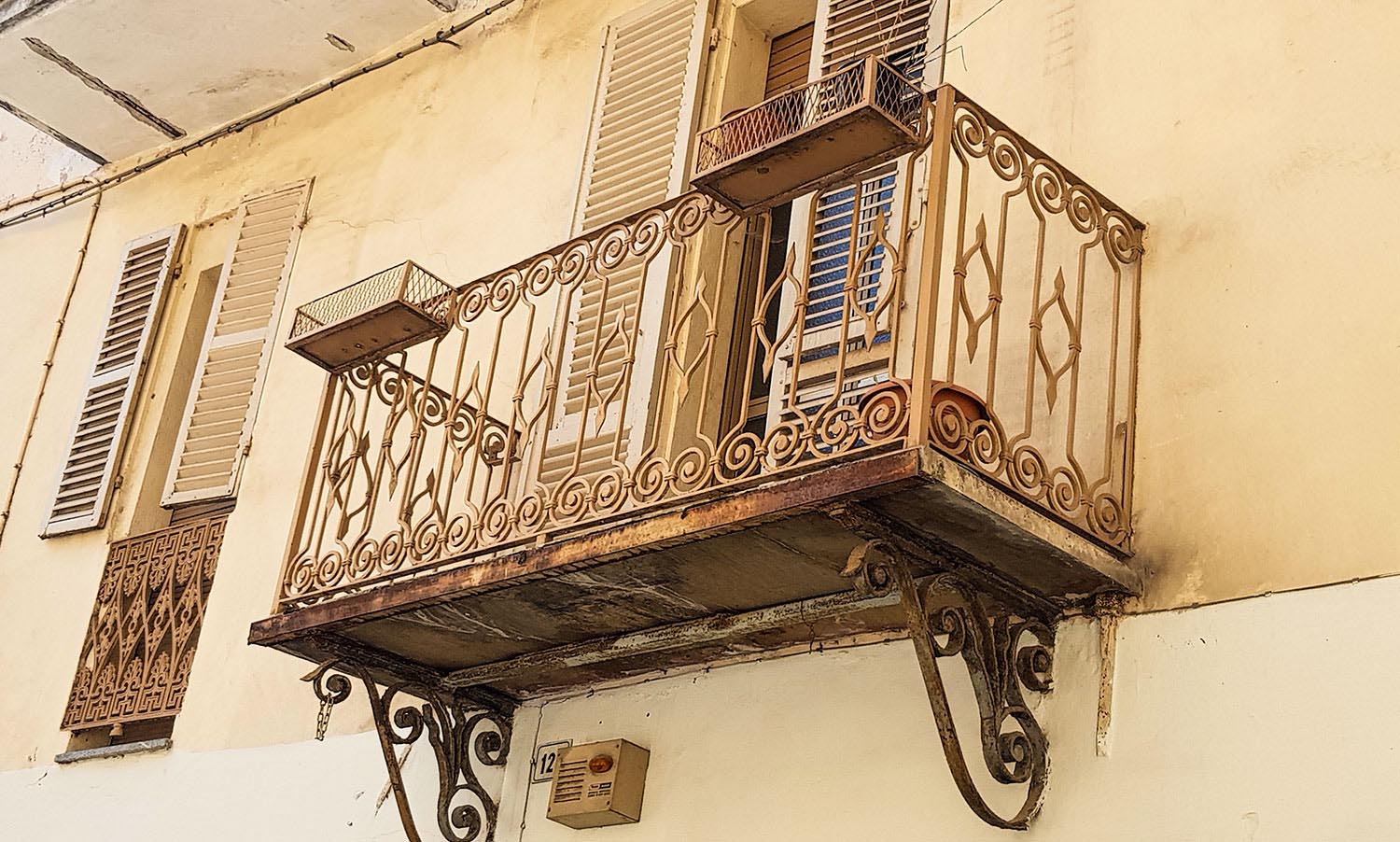 Der höchste Punkt der Strecke ist der Colle del Mortè mit 711 Metern. Oben auf dem Pass steht ein unscheinbares Haus, doch lass dich nicht abschrecken, es ist eine hochgelobte Trattoria (Trattoria Cacciatori), bei der ich beim nächsten Mal unbedingt einkehren möchte. Die Google-Rezensionen versprechen „exzellente piemontesische Küche zu sehr fairen Preisen“. Als nächster Ort folgt Chiusa di Pesio. Eine geschichtsträchtige Ortschaft im Pesio-Tal mit dem Kartäuserkloster Santa Maria zehn Kilometer weiter südlich. Mir gefallen die schmiedeeisernen Balkone und so langsam bekomme ich einen Blick für die Besonderheiten der piemontesischen Bauweise.