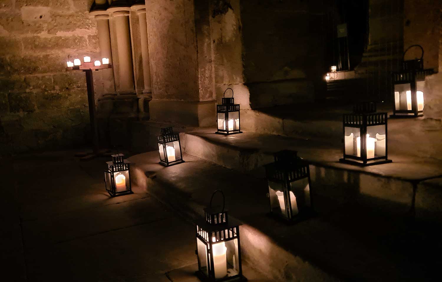 Als nächstes bewundern wir in der gegenüberliegenden Priesterkirche (Herrenchor) das wertvolle Chorgestühl aus dem 15. Jahrhundert. Aber ehrlich, so richtig gemütlich sehen deren Holzbänke auch nicht aus, man lehnte sich wohl eher an, als dass man saß. Der Weg führt weiter zum Kapitelsaal, Kreuzgang, Parlatorium, Brunnenhaus und Refektorium. 300 Kerzen beleuchten unseren abendlichen Rundgang, und mit jedem Schritt tauchen wir tiefer in das einfache klösterliche Leben im Mittelalter ein.