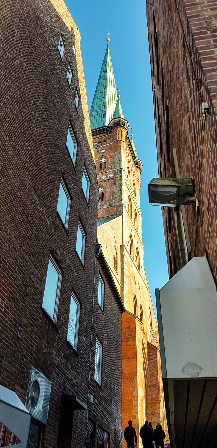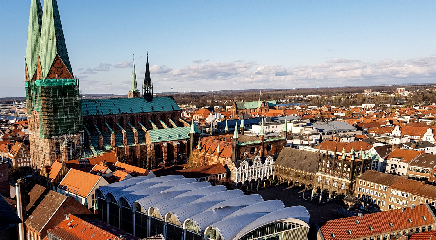 Den schönsten Blick auf die Altstadt hast du vom Turm der St. Petri-Kirche. Richtung Westen entdeckst du das Holstentor und weiter nordöstlich die Marienkirche, den Markt, das Buddenbrockhaus und das Rathaus.