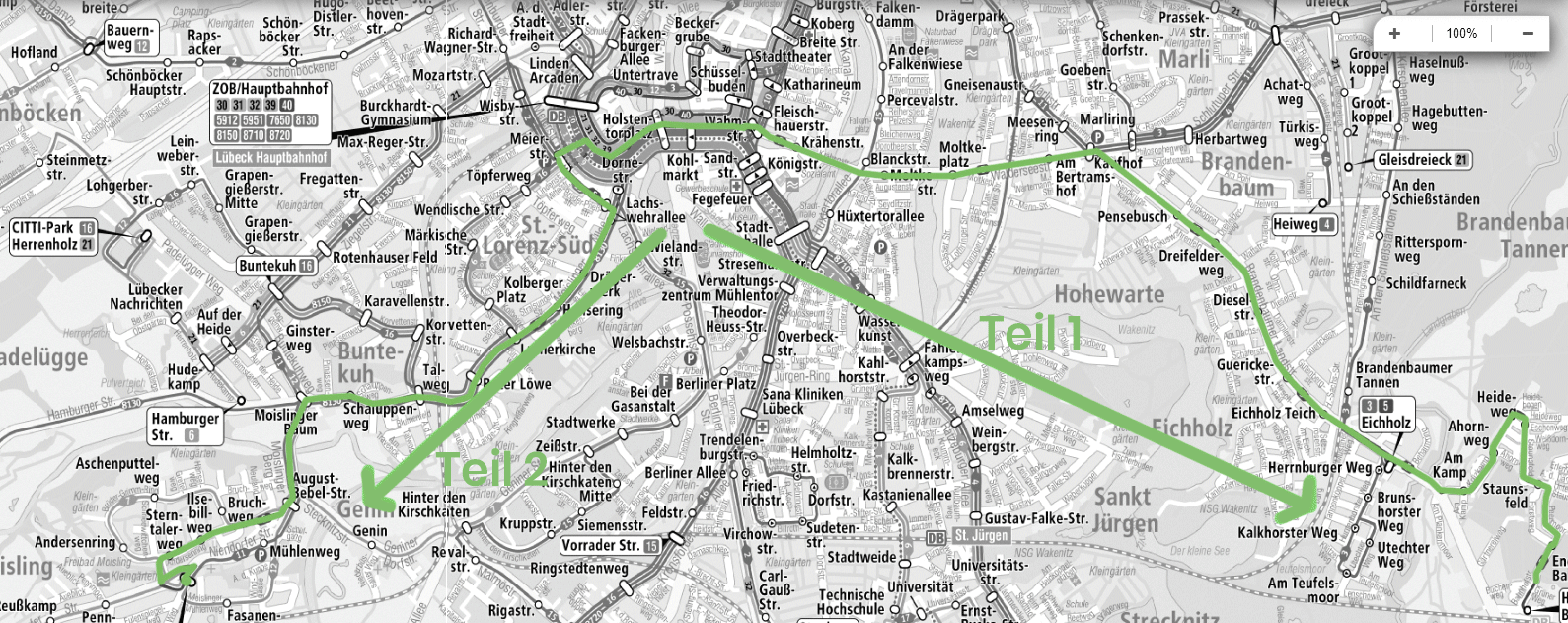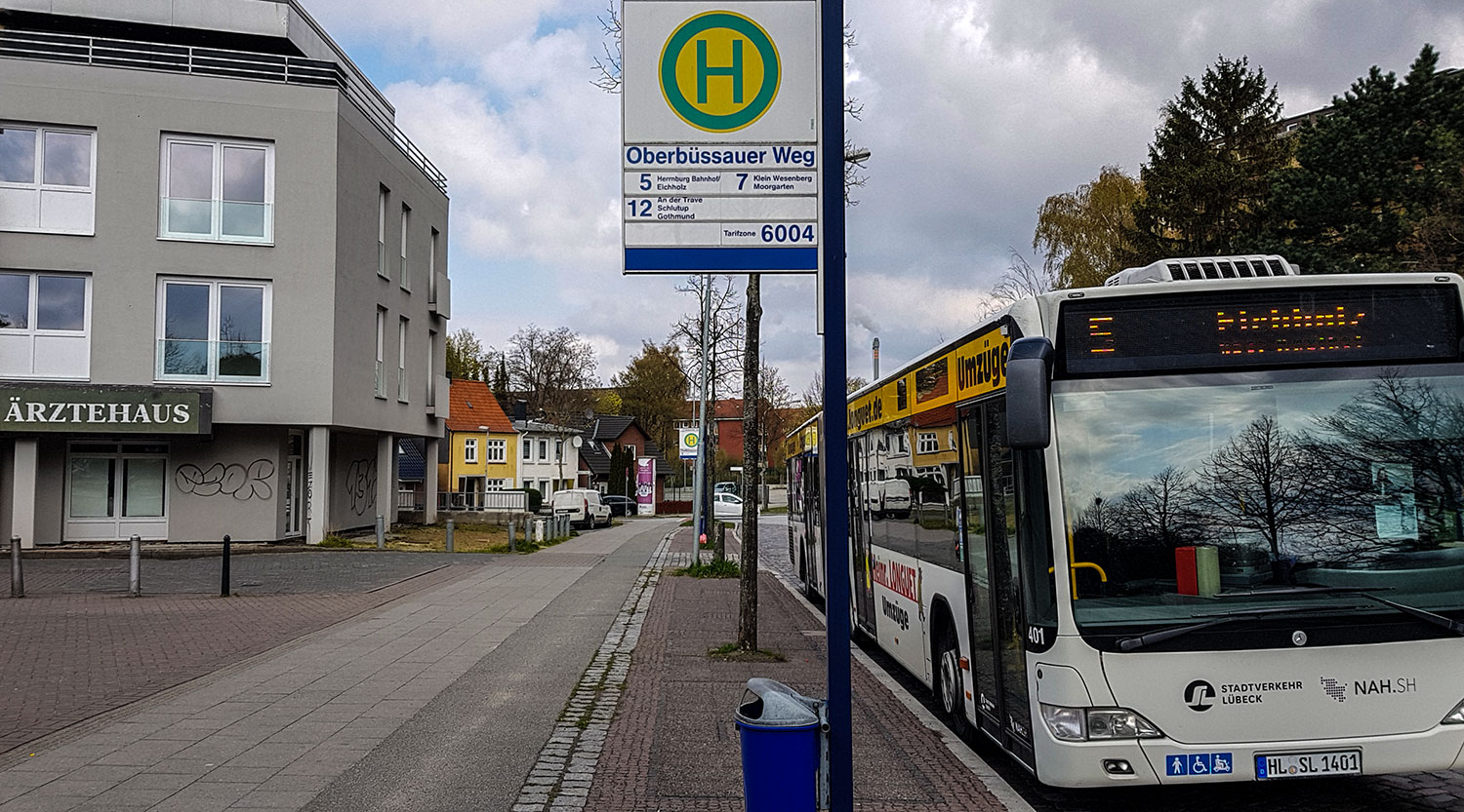 Im zweiten Teil erkunde ich den Südwesten von Lübeck. Vom Zentralen Omnibusbahnhof fährt der Fünferbus ab Bussteig 10 durch St. Lorenz Süd am Drägerwerk und Hansaring vorbei bis raus nach Alt-Moisling.