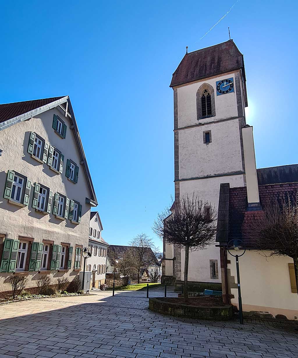 Der Parkplatz an der S-Bahn-Haltestelle in Ehningen ist nicht schön, erfüllt aber seinen Zweck. Wenn du mit dem Auto anreist findest du hier stets einen Parkplatz. Alternativ erreichst du den Bahnhof Ehningen in nur 30 Minuten von Stuttgarts Hauptbahnhof aus mit der S1. Am Eingang des Parkplatzes begrüßt uns bereits das erste Wegschild des HW 5, das uns in Richtung Ortsmitte weist. Wir folgen der Dagersheimer Straße, schlendern an der Kirche vorbei und setzen unseren Weg dann fort über die Hildrizhausener Straße bis zum IBM-Komplex. Achtung! Du musst in die IBM-Allee einbiegen, dann gelangst du zur Unterführung der Autobahn und auf der anderen Seite in den Wald. (Wir sind zunächst geradeaus weiter gegangen. Das ist aber falsch – du endest dann im Nirgendwo beim Tennisclub Ehningen und musst zurücklaufen oder bei der Landstraße die Autobahn überqueren.)
