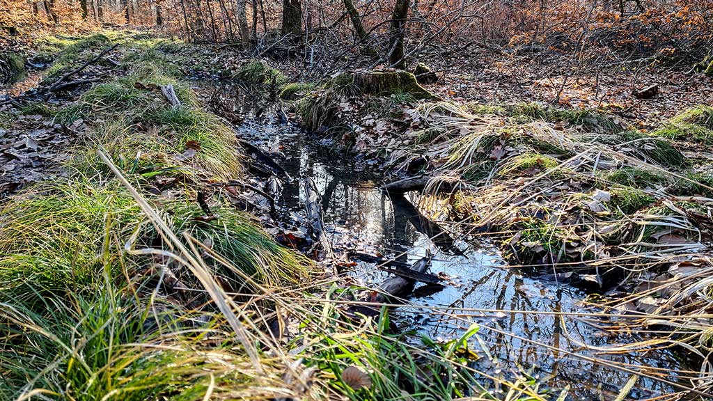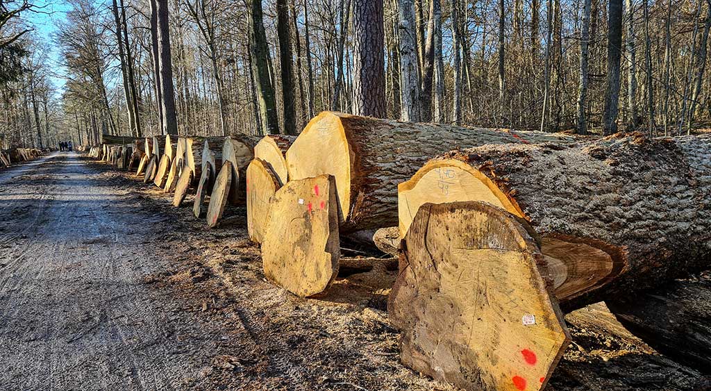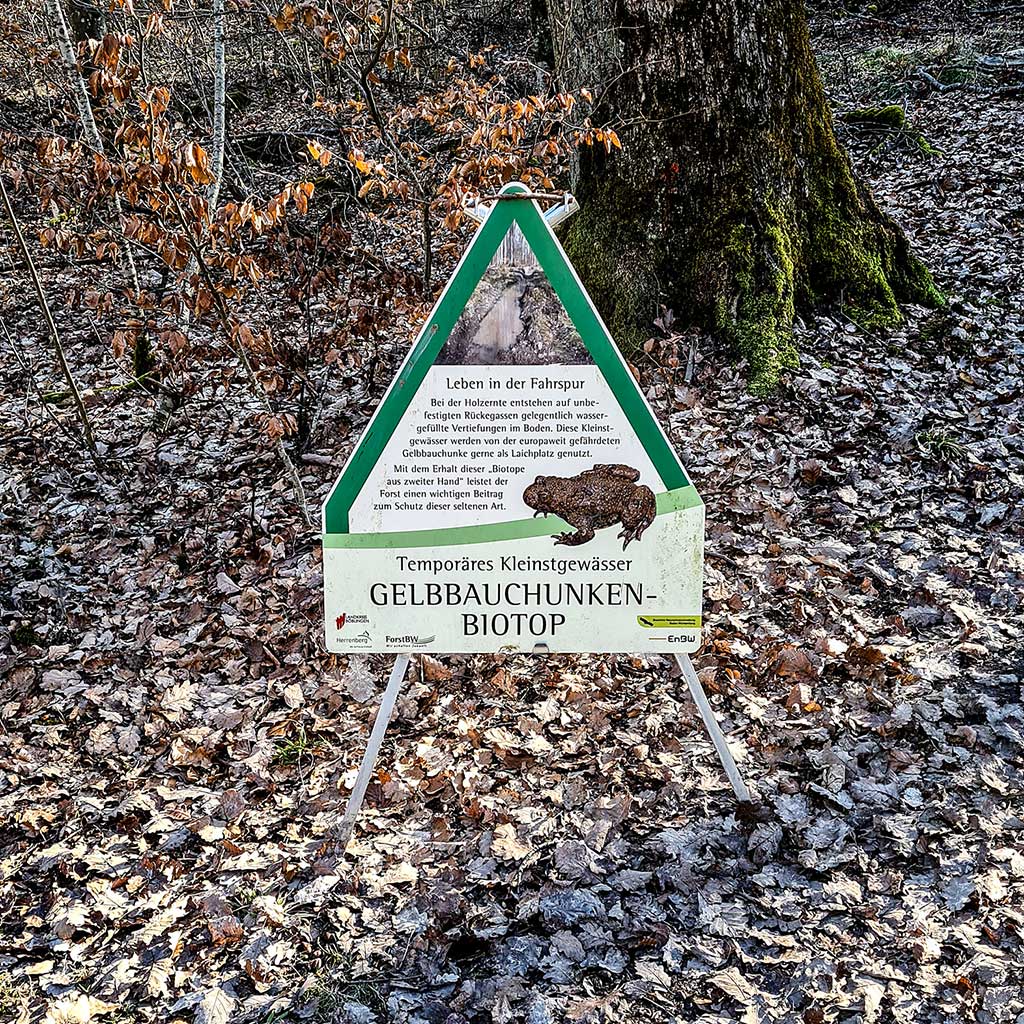 Während wir uns dem Stellberg nähern, beeindrucken uns die imposanten Eichenstämme entlang der Bebenhäusener Allee. Ralph klärt mich auf, dass solche Stämme auf dem Holzmarkt teuer gehandelt werden. Angesichts der vielen Stämme frage ich mich, ob noch genügend Wald übrig bleibt? Doch keine Angst, es wird immer weniger geerntet, als nachwächst, damit das Ökosystem Wald in der Balance bleibt. Mein Blick fällt auf eine große Wasserpfütze, die sich in der Fahrspur der mächtigen Waldarbeitermaschinen gebildet hat. Ein Hinweisschild klärt mich darüber auf, dass diese temporäre Wasseransammlung ein „Biotop für Gelbbauchunken“ sei. Doch so viel ich schaue, keine Unke lässt sich blicken. Es scheint, als hätten sie sich geschickt getarnt.