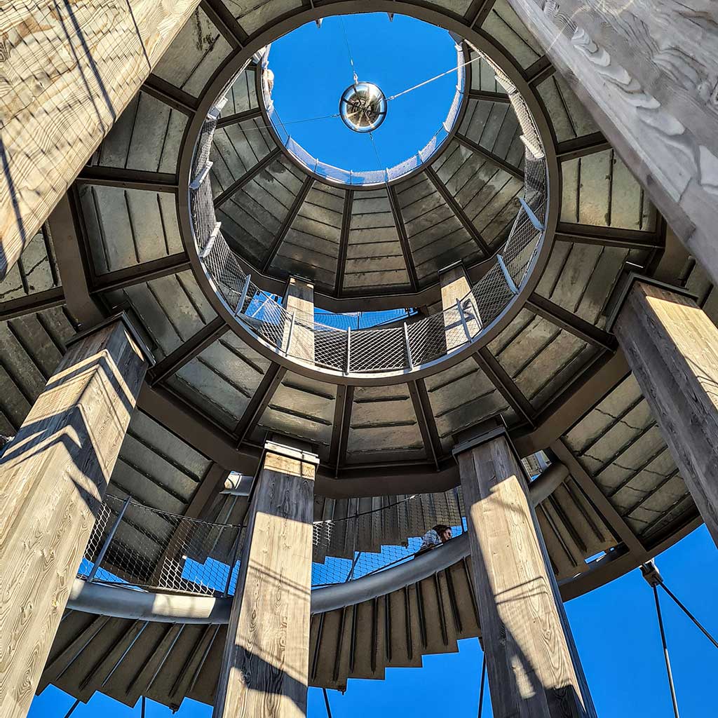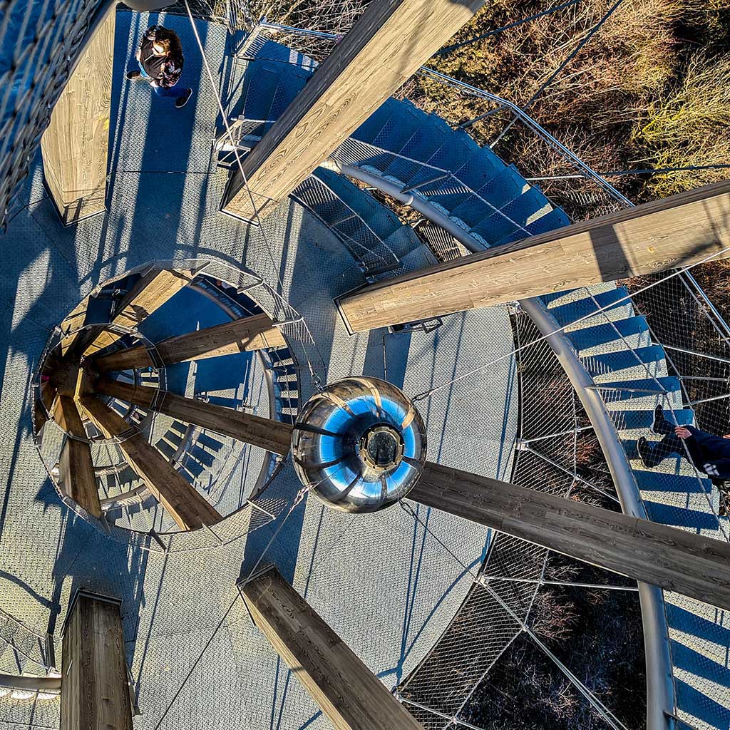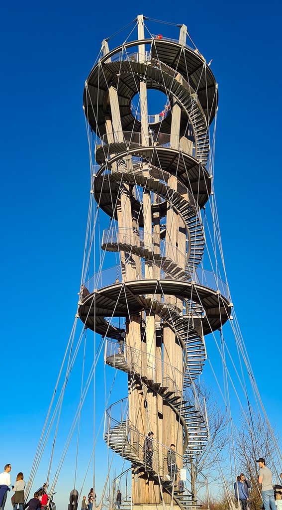 „Was nix koscht, isch au nix wert“- sagt der Schwabe gern. Doch auf den Schönbuchturm trifft dieser Spruch überhaupt nicht zu. Der Aussichtsturm ist ein echter Blickfang und kostet wirklich keinen Eintritt. Seit 2018 prägt der 35 Meter hohe Turm den Stellberg (580m ü. NN). Wer bereits den Killesbergturm in Stuttgart besucht hat, wird Ähnlichkeiten feststellen. Kein Wunder, denn das Stuttgarter Ingenieurbüro Schlaich hat beide konstruiert und erbaut. Der Aufstieg lohnt allemal. Bis nach oben sind es 174 Stufen und die gleiche Anzahl gehst du dann auch wieder über eine gegenläufige Wendeltreppe hinunter.
