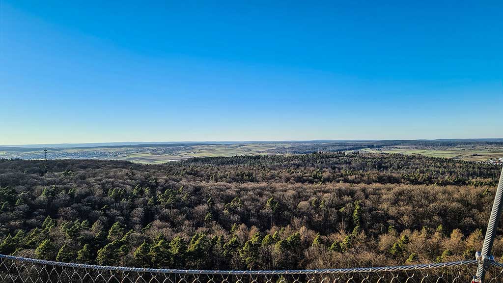Zum Abschluss genießen wir die atemberaubende Aussicht: Richtung Westen blicken wir bis zum Nordschwarzwald, südöstlich entdecken wir die Höhenzüge der Alb und im Norden liegen uns Böblingen und Sindelfingen zu Füßen.