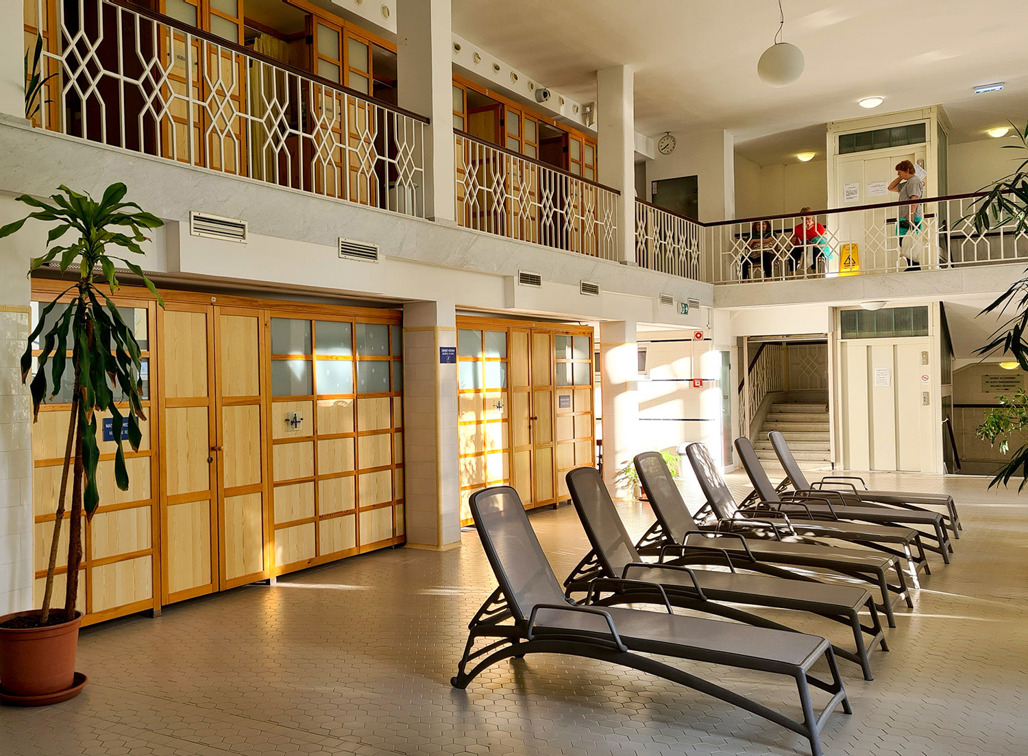 Das Széchenyi-Bad wurde im Renaissance-Stil errichtet und atmet aus jeder Pore das Flair der Jahrhundertwende. Auch die Details lohnen einen Blick: Es gibt Deckengemälde in der Eingangshalle, nostalgische weiße Umkleidekabinen und schöne Holztreppen. Einzig allein vermisse ich Ruheliegen im Innenbereich. Die gibt es nur draußen. Der Outdoorbereich ist wunderschön, in der Mitte das Schwimmerbecken, rechts und links davon jeweils ein Freizeitbecken mit Massagedüsen und Sprudlern. Hier treffen sich die Touristen, um Instagramfotos zu schießen und die Rentner zum Schach spielen.