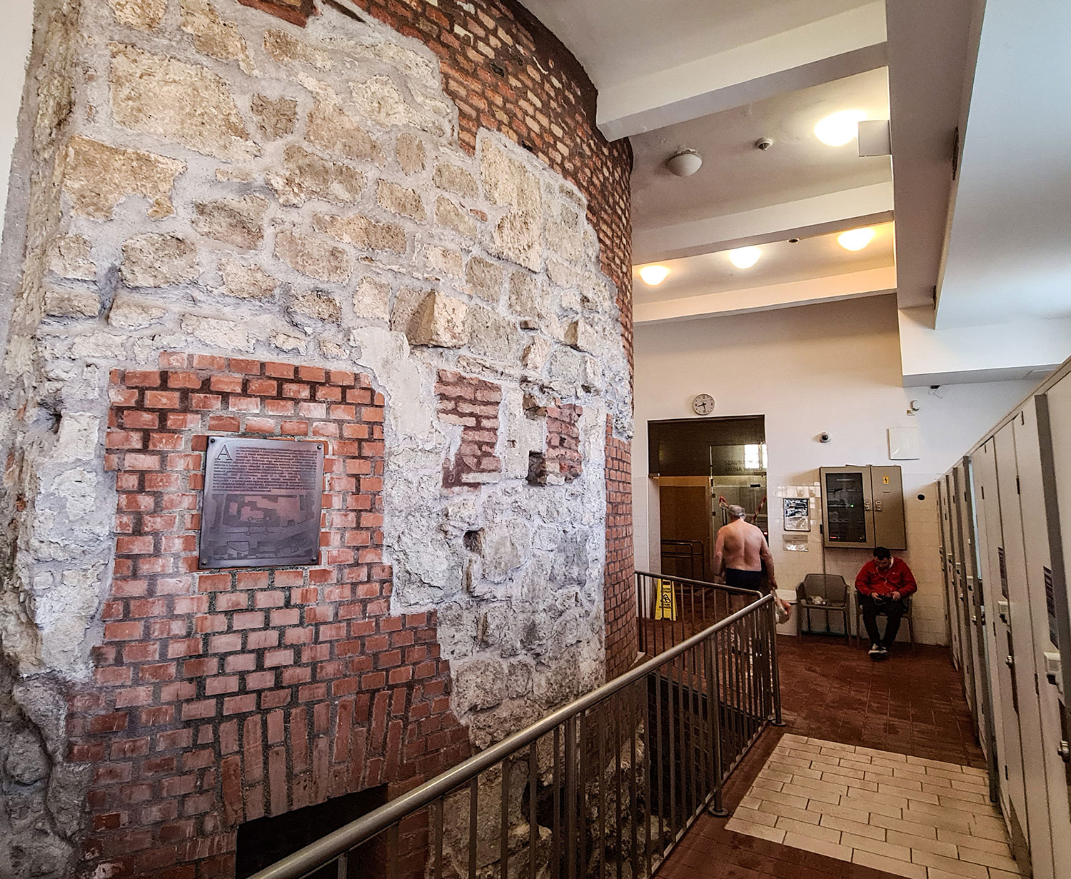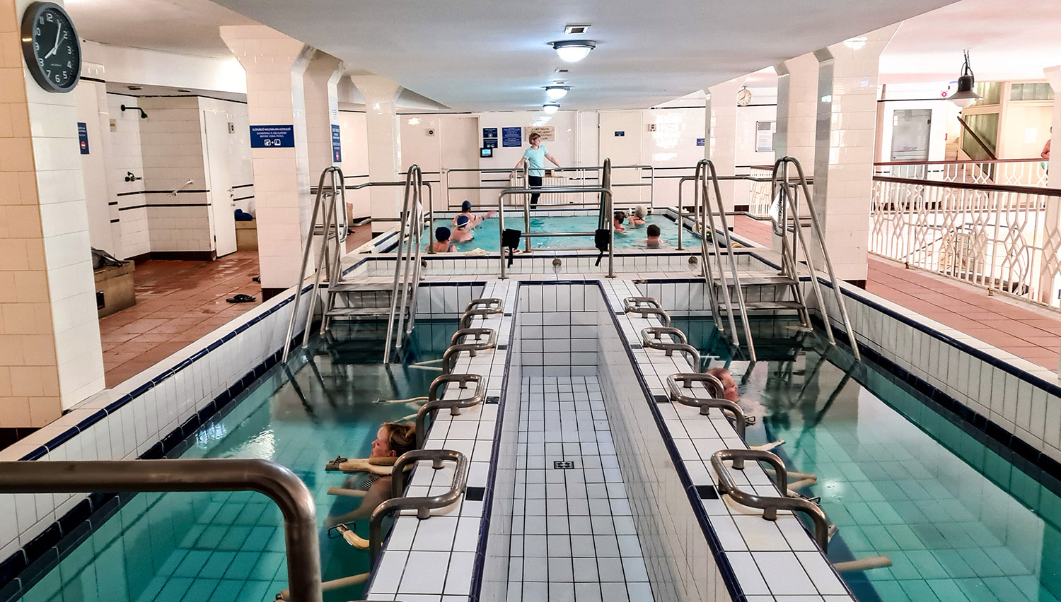 „Das sieht martialisch aus, ist aber völlig schmerzfrei“, erklärt mir Mirkó Szitovsky. Er ist Deputy Manager im Lukács-Bad und führt mich herum. Wir sind in der medizinischen Abteilung. Am Kopf fixiert hängen die Patienten mit Gewichten an den Beinen im Wasser. „Das ist ein Gewichtsbad, es streckt die Wirbelsäule und entlastet die Bandscheiben. Jeder kann sich hier behandeln lassen, vorausgesetzt, er bringt eine ärztliche Verordnung mit.“ Das Lukács-Bad hat von allen Bädern in Budapest das Wasser mit der stärksten Heilwirkung. Dessen heiße Quellen wurden bereits von den Johanniterrittern im 12. Jahrhundert genutzt. Später reisen aus aller Welt Pilger an, die Linderung suchten und Heilung fanden. Davon zeugen die vielen Dankestafeln an der Außenwand im Hof.