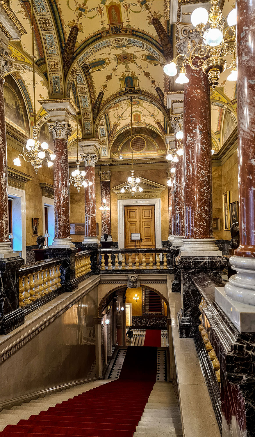 Das Opernhaus hat Kaiser Franz Joseph von Österreich mitfinanziert. Einzige Bedingung, das Haus solle nicht größer werden als die Wiener Oper. Dafür ist es aber prachtvoller und opulenter geworden, für viele ist sie eines der schönsten Opernhäuser weltweit. Für das Kaiserpaar gab es einen Extra-Treppenaufgang, an deren Ende ein Spiegel hängt, der schlanker macht. Das gefiel der Kaiserin Sissi. Der Spiegel hängt noch immer dort, doch auch der Treppenaufgang für das „normale Volk“ ist phänomenal. Zum Abschluss der Führung sangen die Künstler für uns im besagten Treppenhaus.