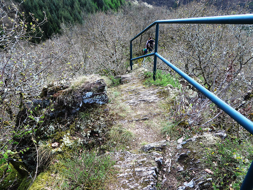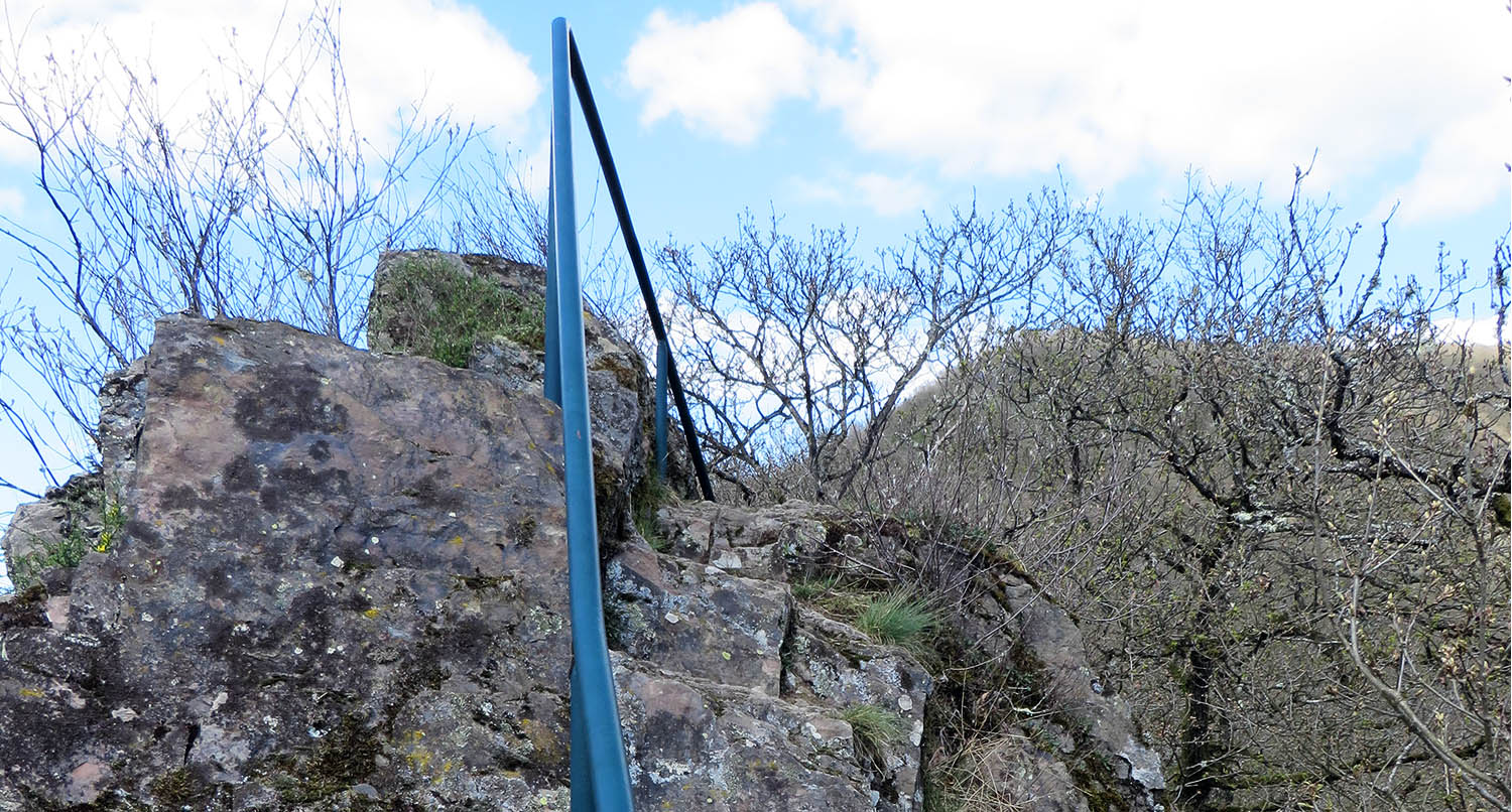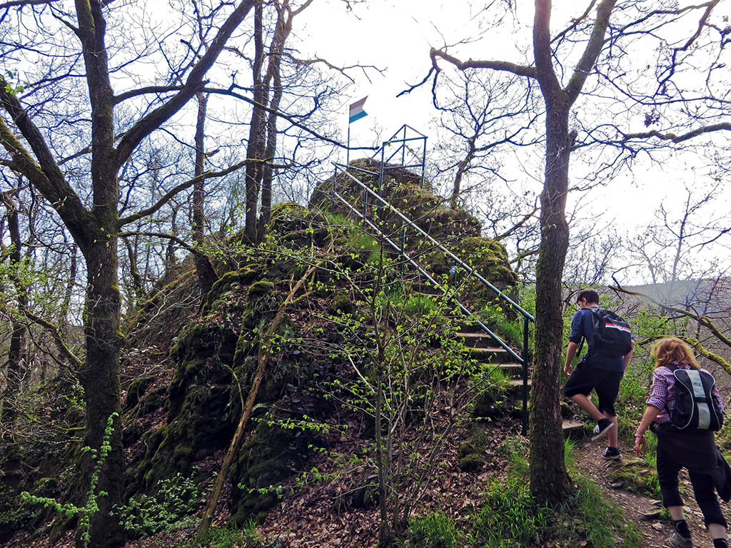 Besonders spannend ist dann der Abstieg über den Lätgesberg. Der Weg verläuft jetzt direkt an der Grenze zwischen Deutschland und Luxemburg und wird deshalb auch als Grenzsteig bezeichnet. Es ist kein richtiger Klettersteig, aber wir bewegen uns immer oben an der Felskante und zu beiden Seiten fällt der Berg steil ab. Der Pfad ist mit einem Geländer gesichert und für uns gut machbar.