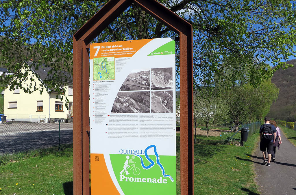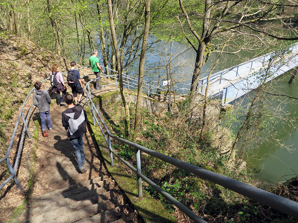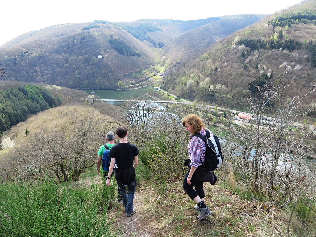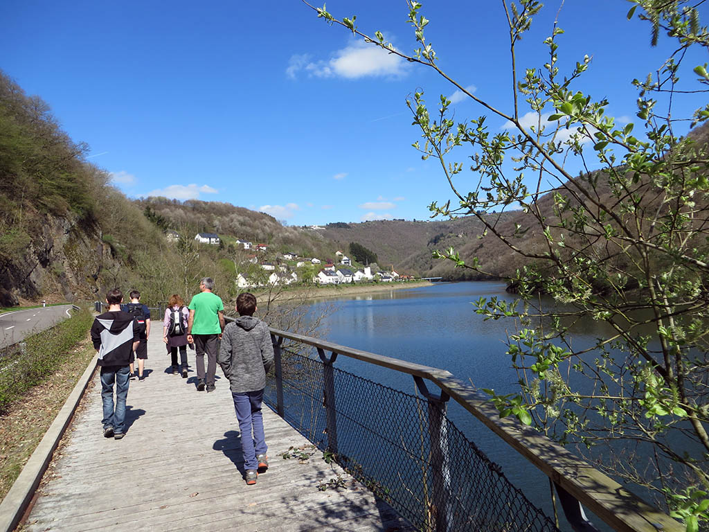 Das Wetter ist herrlich an diesem Karfreitag. Jean-Luc und ich sind mit meinem Bruder und seiner Familie zum Wandern verabredet. Wir starten am Parkplatz an der Ourtal-Sperre oberhalb von Vianden. Zunächst führt der Weg die Uferpromenade entlang bis zum luxemburgischen Ort Bivels. Auf einer Infotafel lesen wir, dass der deutsch-luxemburgische Grenzfluss Our Anfang der 60er-Jahre zum See aufgestaut wurde und viele Häuser und die Kirche erst platt gemacht und dann wieder aufgebaut wurden. Der Ourtal-Stausee ist Teil des Pumpspeicherwerks Vianden, das zur Stromerzeugung genutzt wird. Es ist das größte seiner Art in Europa.