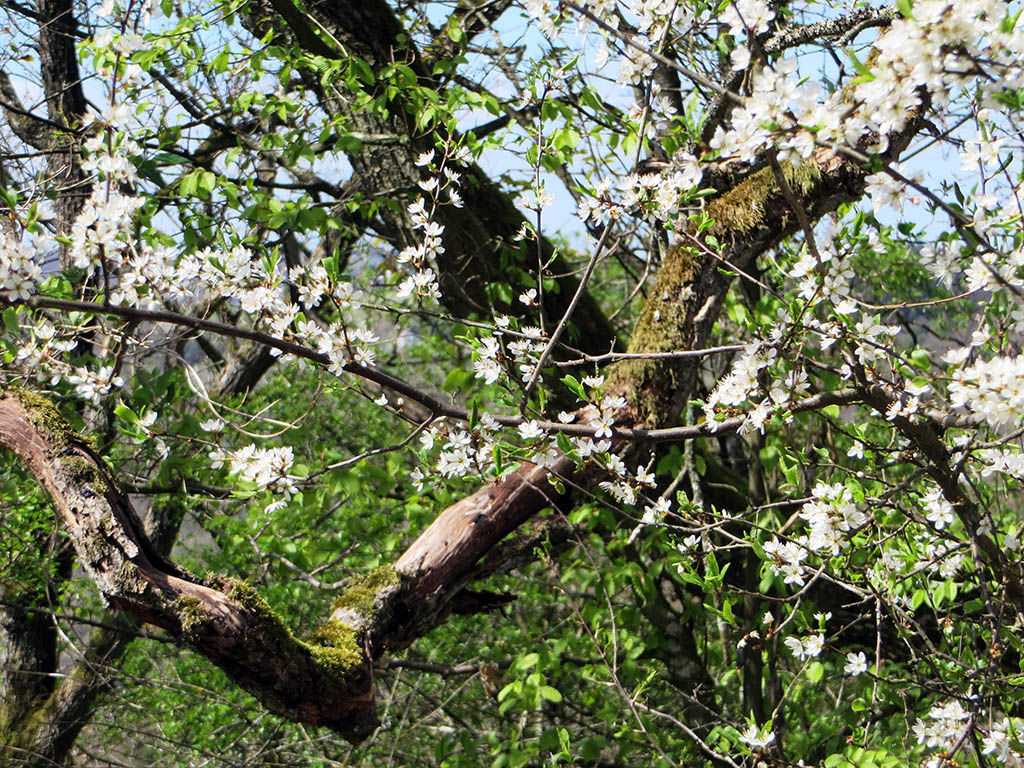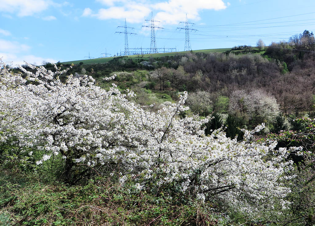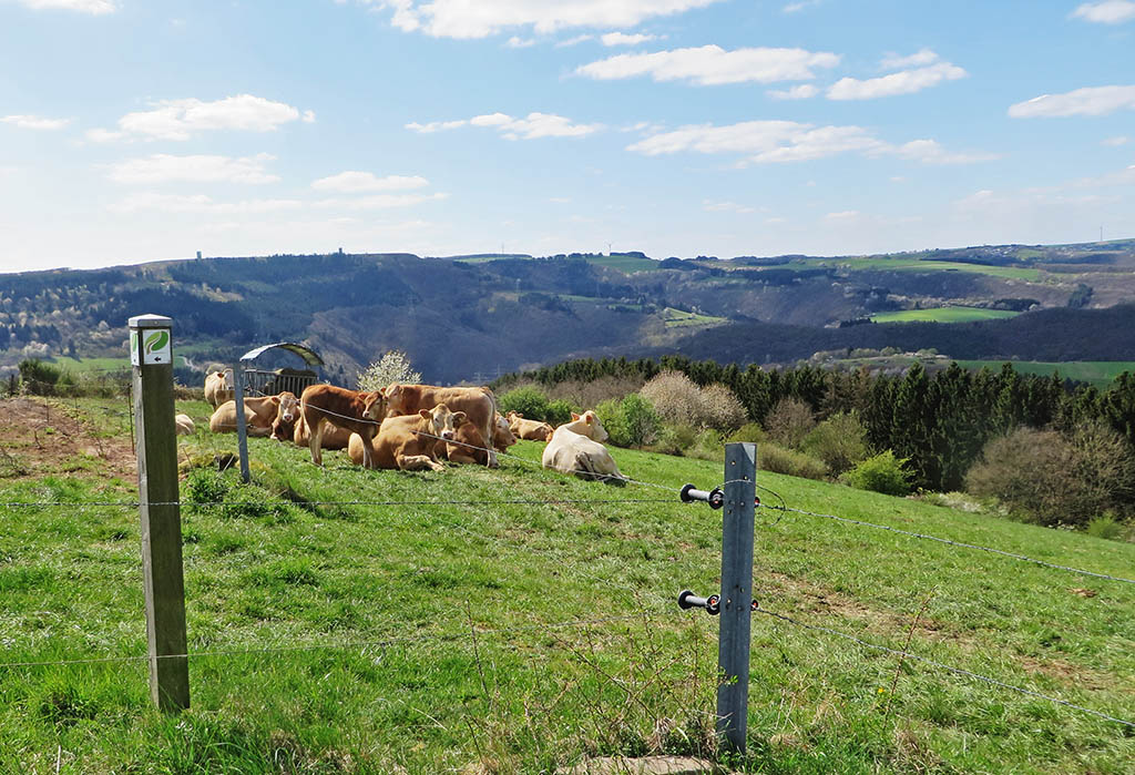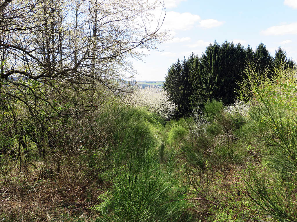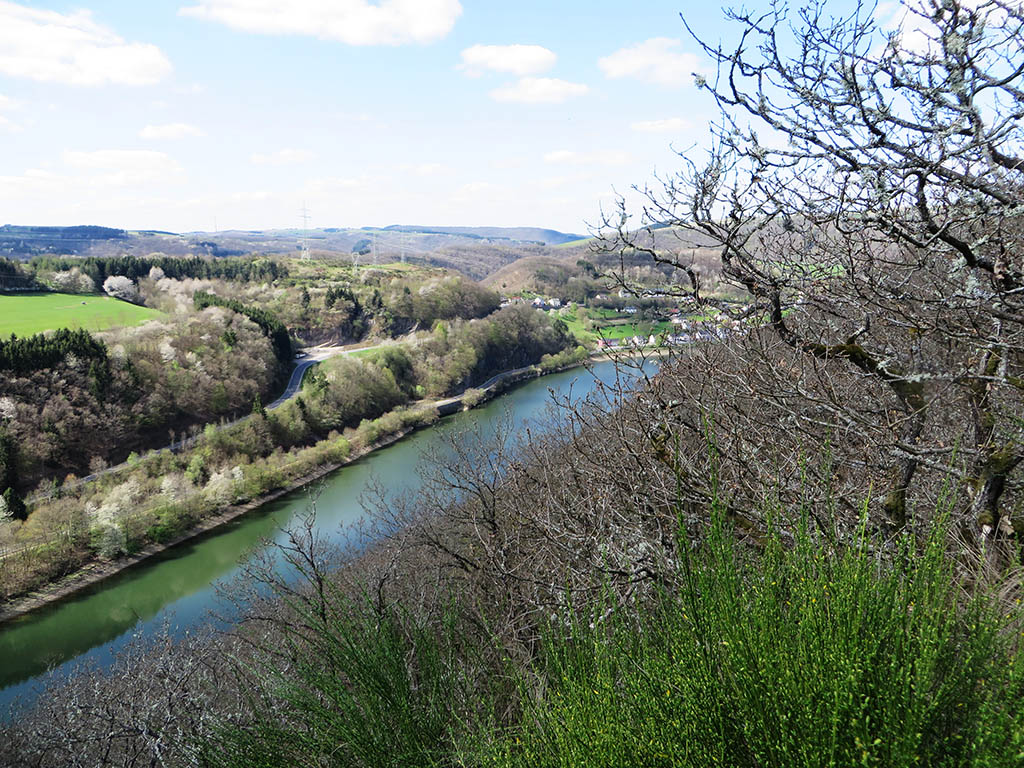 Schließlich sind wir oben und werden bei herrlichem Sonnenschein mit einem 1a-Panoramablick über das Our-Tal belohnt. Ringsum erwacht die Natur aus dem Winterschlaf. Der Weißdorn und die wilden Kirschbäume blühen um die Wette und beim Ginster öffnen sich die ersten Blüten. Die Farbpalette reicht von Schiefergrau über strahlendes Weiß, helles und dunkles Grün bis hin zu einem zarten Gelb. Schmetterlinge flattern und Bienen summen. Der Stausee liegt weit unten, die Burg Falkenstein entdecken wir auf halber Höhe.
