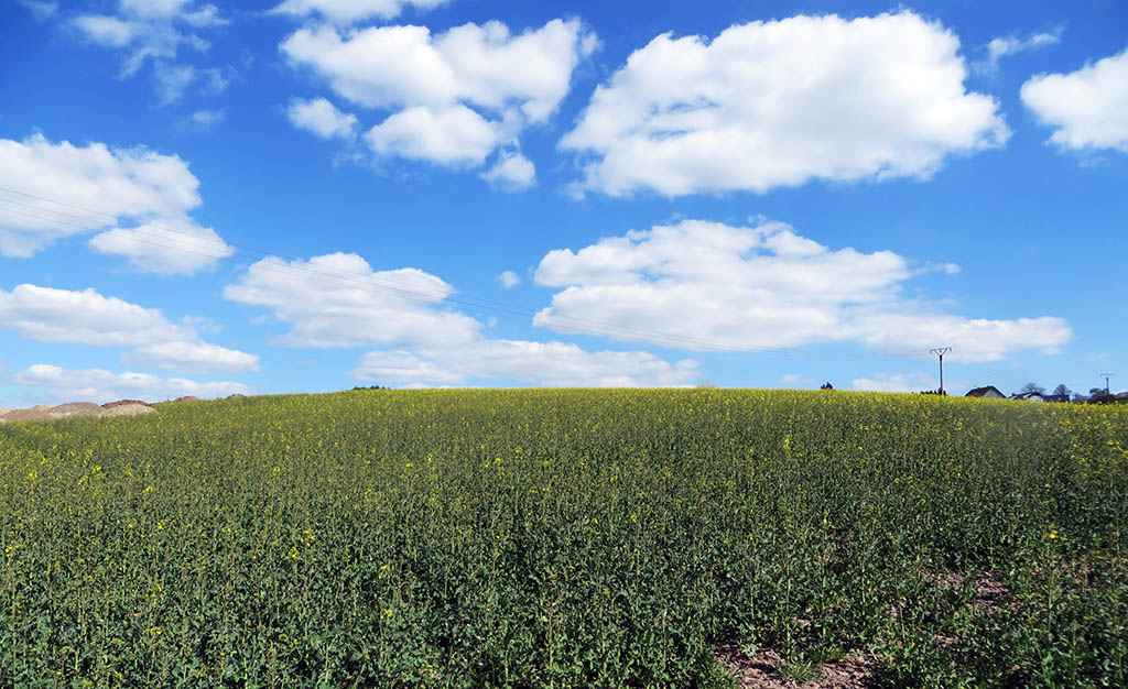 Der nächste Abschnitt verläuft auf der Höhe. Es geht nur noch leicht auf und ab. Wir nähern uns em Ort Bauler. Am Horizont über dem Rapsfeld blitzen die ersten Häuser auf.  Doch wir wandern nicht in den Ort hinein, sondern bleiben unterhalb. Auf einer Wiese nehmen die Kühe ein erstes Sonnenbad und genießen die Aussicht. Hier oben bist du dem Himmel sehr nah.