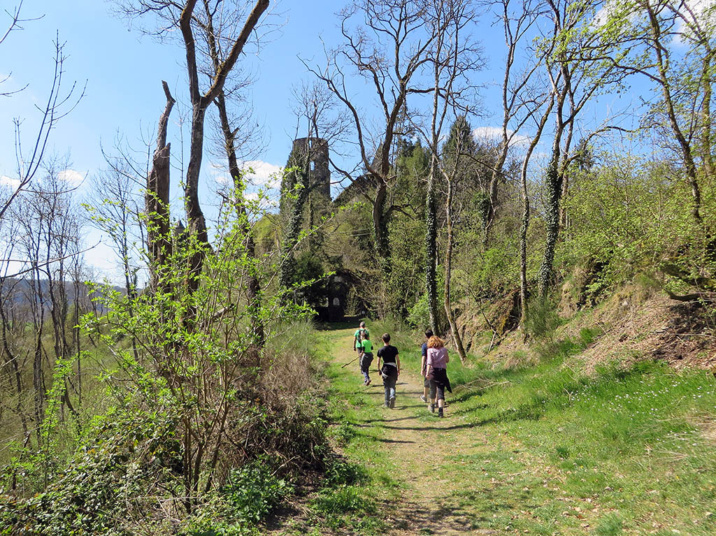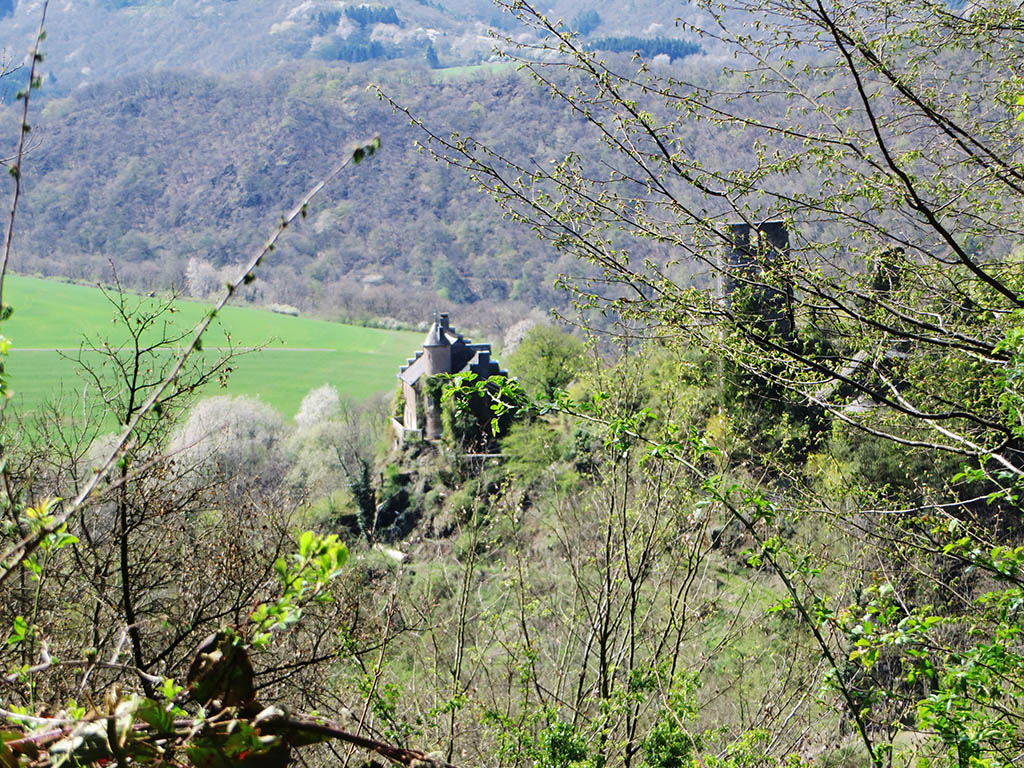 In Bivels nehmen wir den Fußgänger-Steg über den Stausee und gelangen auf die deutsche Seite. Unser Weg führt durch einen lichten Buchenwald den Berg hinauf. Mit jedem Schritt in die Höhe wird der See kleiner. Ich sehe links unten am Ufer noch einen Angler, der geduldig auf seinen Karfreitagsfisch wartet. Nach einer halben Stunde erreichen wir das erste Etappenziel: Die Burgruine Falkenstein thront auf einem Bergfels hoch über der Ourtalschleife. Das Burgtor ist leider verschlossen, aber auch der Platz vorm Tor ist wunderschön und romantisch. Wir gönnen uns eine kurze Pause.