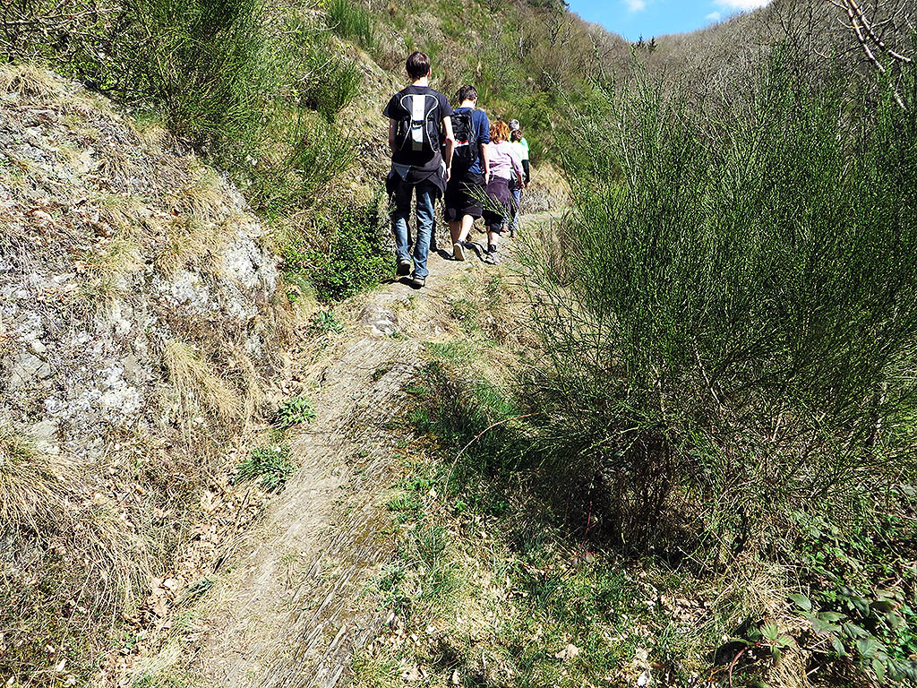 Dann wird es richtig anstrengend. Aus dem Weg wird ein Pfad, zwischen Felsen und Ginsterbüschen schlängelt er sich steil den Berg hinauf. Die Erde ist staubtrocken und steinig. In der Mittagshitze bei diesem gleißenden Licht wähnt man sich eher in den kargen Höhen der Ardeche, als in der Südeifel. Ich schwitze und schnaufe und merke, dass ich nach der langen Winterruhe noch ziemlich untrainiert bin. Mir dämmert, warum die Wanderung als „anspruchsvoll“ deklariert ist.