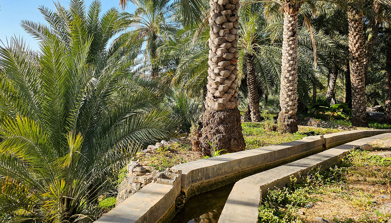 Das Wasser kommt aus den Bergen, wird gesammelt und über ein einzigartiges Kanalsystem (UNESCO-Weltkulturerbe) zu den Feldern geleitet. Die Wasserzuteilung erfolgt streng nach Plan, dafür gibt es extra einen Wasserwärter. Ahmed erklärt mir, dass er alle neun Tage für sechs Stunden Wasser bekommt. Er ist sichtlich stolz auf seine über 120 verschiedenen Sorten von Dattelpalmen. Außerdem baut er drei Sorten Bananen, Mangos, vier Sorten Feigen, Papayas, Guaven, Kartoffeln, Weintrauben, Granatäpfel, Knoblauch und Auberginen an.