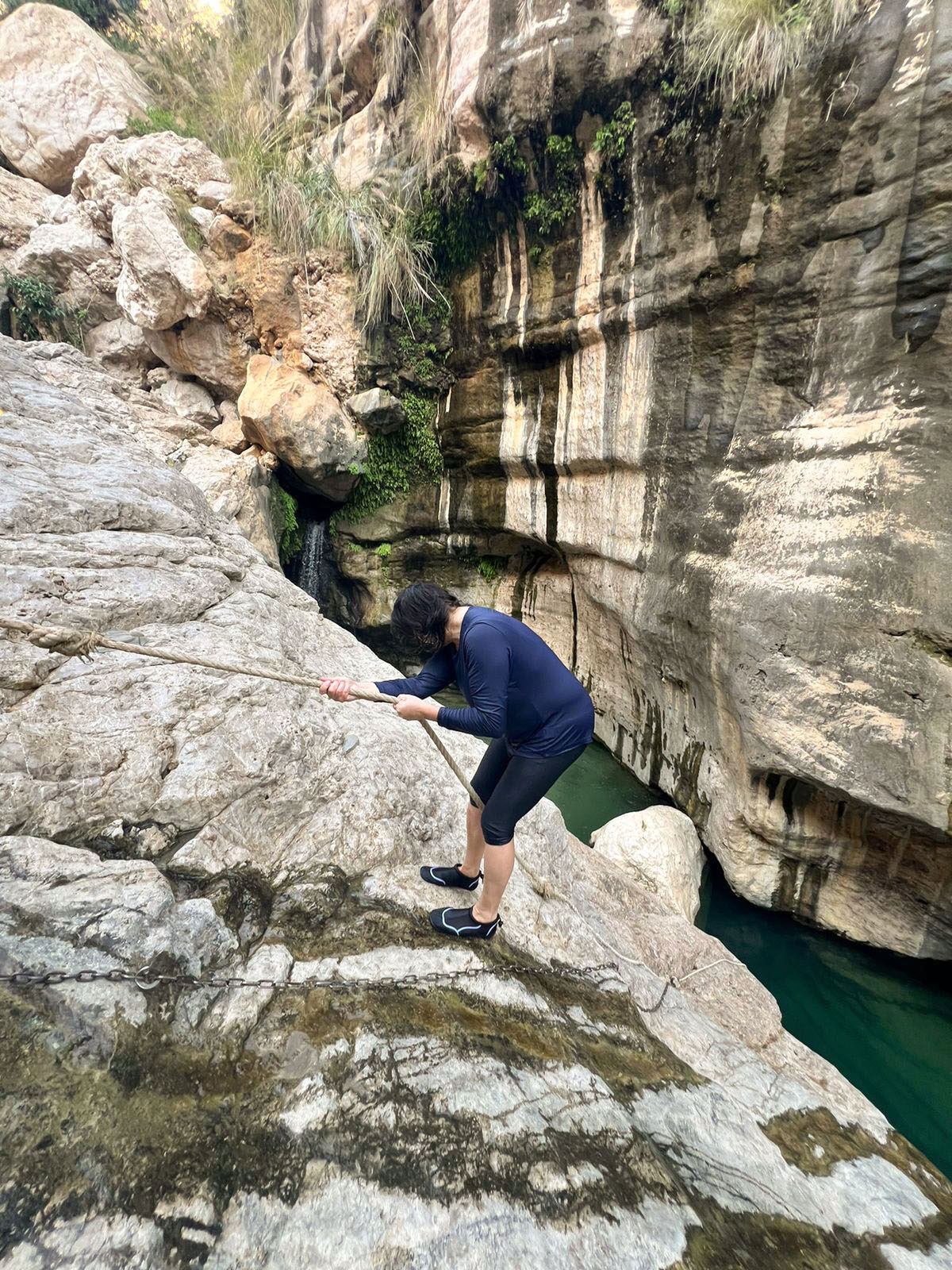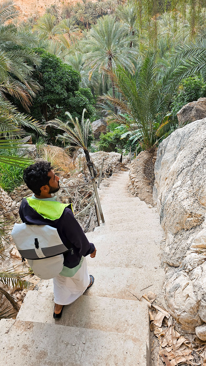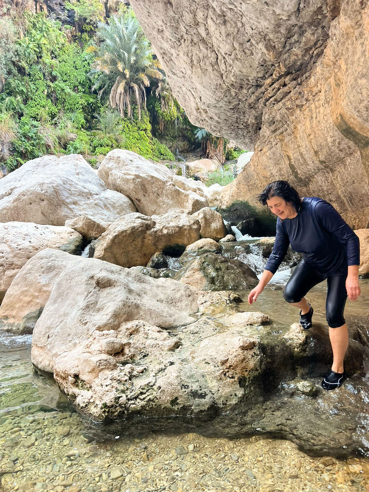 Bei angenehmen 24 Grad schwimme, rutsche und wandere ich durch die Schlucht. Mohammed ist das Wasser zu kalt, er kraxelt am Hang entlang, während ich mich von einem Wasserpool zum anderen durch die Schlucht arbeite. Ich genieße die Ruhe – allein in dieser Naturkulisse fühlt es sich an wie ein kleines Paradies. Der Rückweg? Wieder ein kleines Abenteuer! Zum Glück ist Mohammed genau im richtigen Moment zur Stelle. Bei der Passage mit dem Seil hilft er mir hinauf. Zurück im Dorf begrüßt mich Mohammeds Vater mit Kaffee und Datteln und ich erlebe echte omanische Gastfreundschaft.